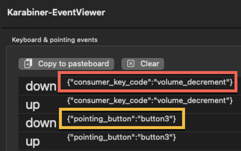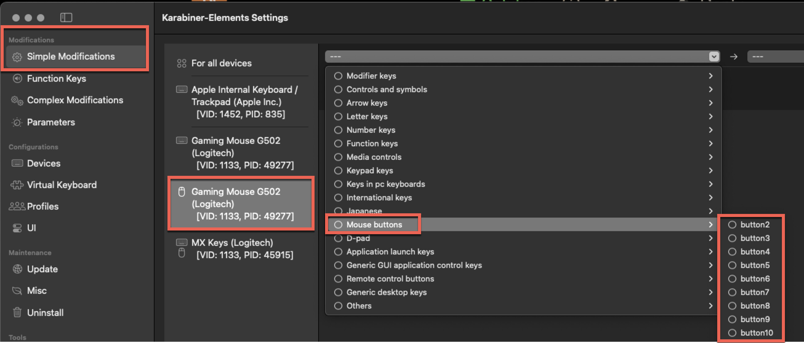If you don't know what "key"/button to override, you can use its Karabiner-EventViewer to get the specific key to override (sometimes the mouse will send raw "button#" (orange rectangle), but sometimes it will just send another function/consumer-key (red rectangle):