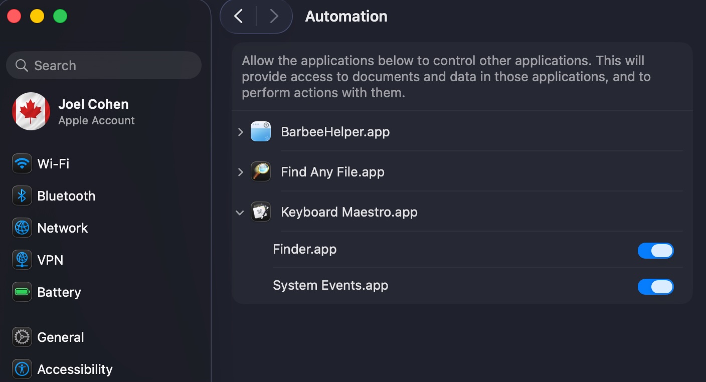 I noticed under the Security settings that unlike the other settings, there is no symbol beside “Web browser automation and control” as pictured below. I further noticed that Safari does not appear under System Settings > Privacy & Security > Automation > Keyboard Maestro (i.e., only Finder and System Events do), also as pictured below. Can someone please explain the correct way of configuring so that Keyboard Maestro can control Safari (which I assume is the purpose of this setting).