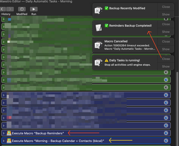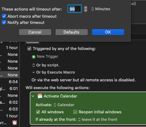 I can see that the macro to backup my Reminders, is working, but then the macro to backup calendar and reminders. It always gets stuck on the simple Activate Calendar action.