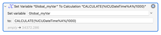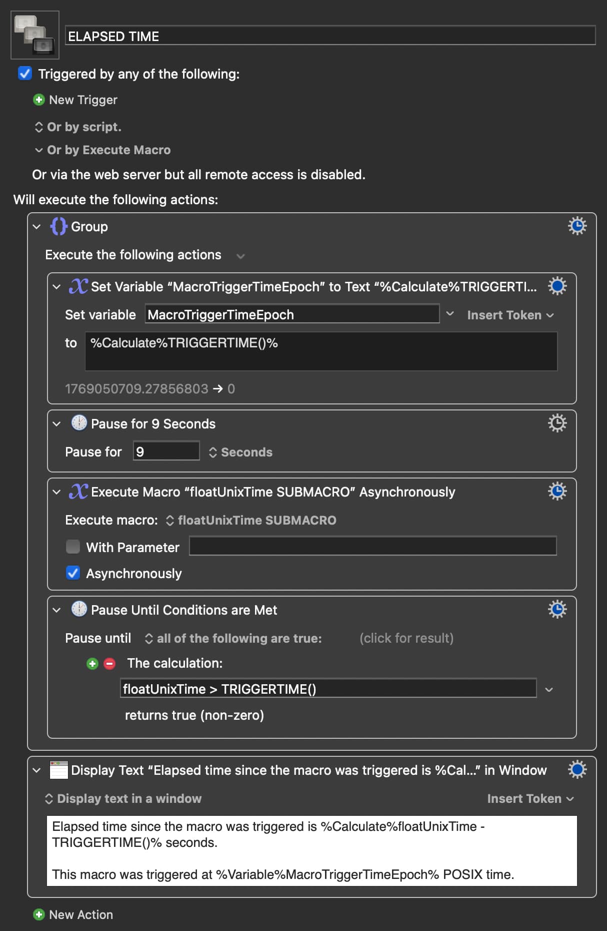 I then use the global variable floatUnixTime and the TRIGGERTIME() function to calculate the time in seconds since the macro was started and the action is run.