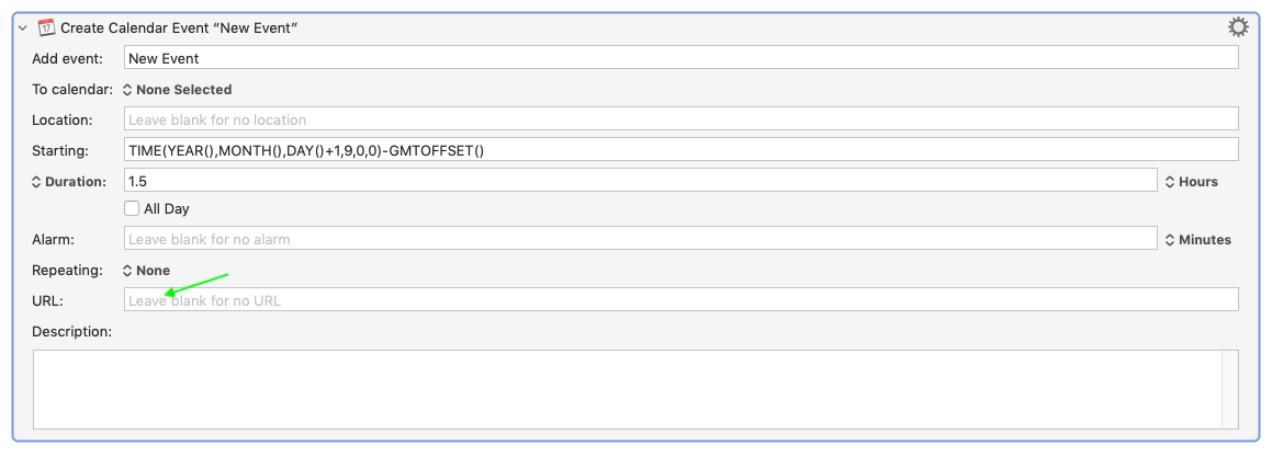 set newEvent tomake new eventincalendar varCal at end with properties {description:varDesc, summary:varName, location:varLocation, start date:varStart, end date:varEnd, allday event:varAllday}