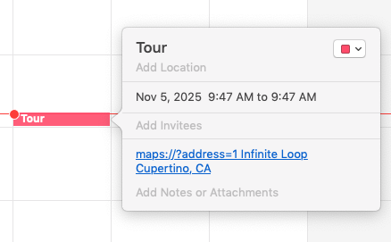 However, if you use the same .ICS file or Shortcut in iOS or iPadOS the calendar event is created with a geographical location - a small map showing the location is visible in the event. If that event is synchronised to macOS via iCloud the resulting event in the macOS calendar also contains the geographical location and the small map.