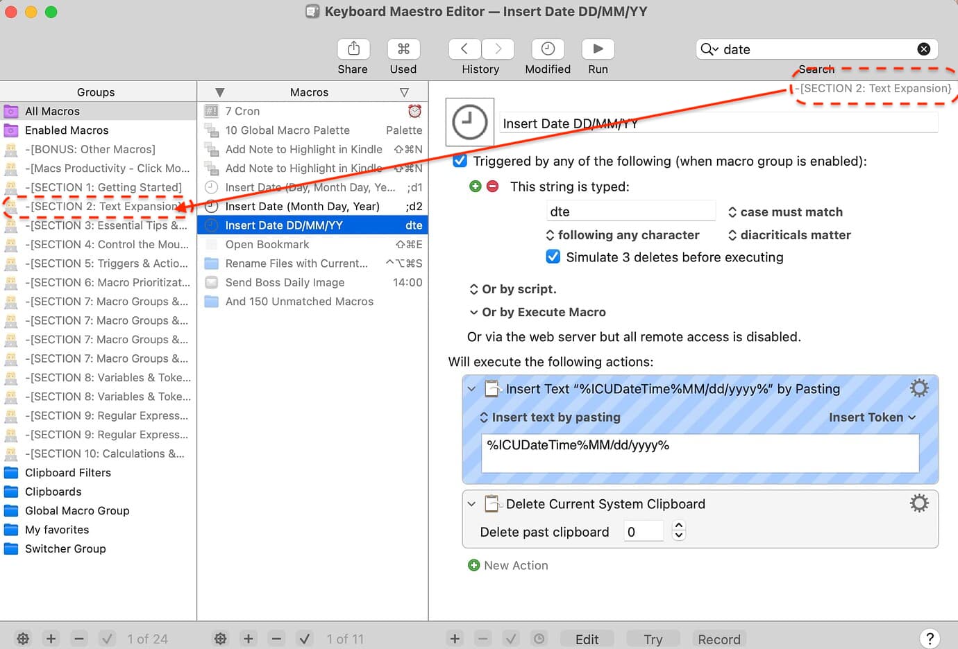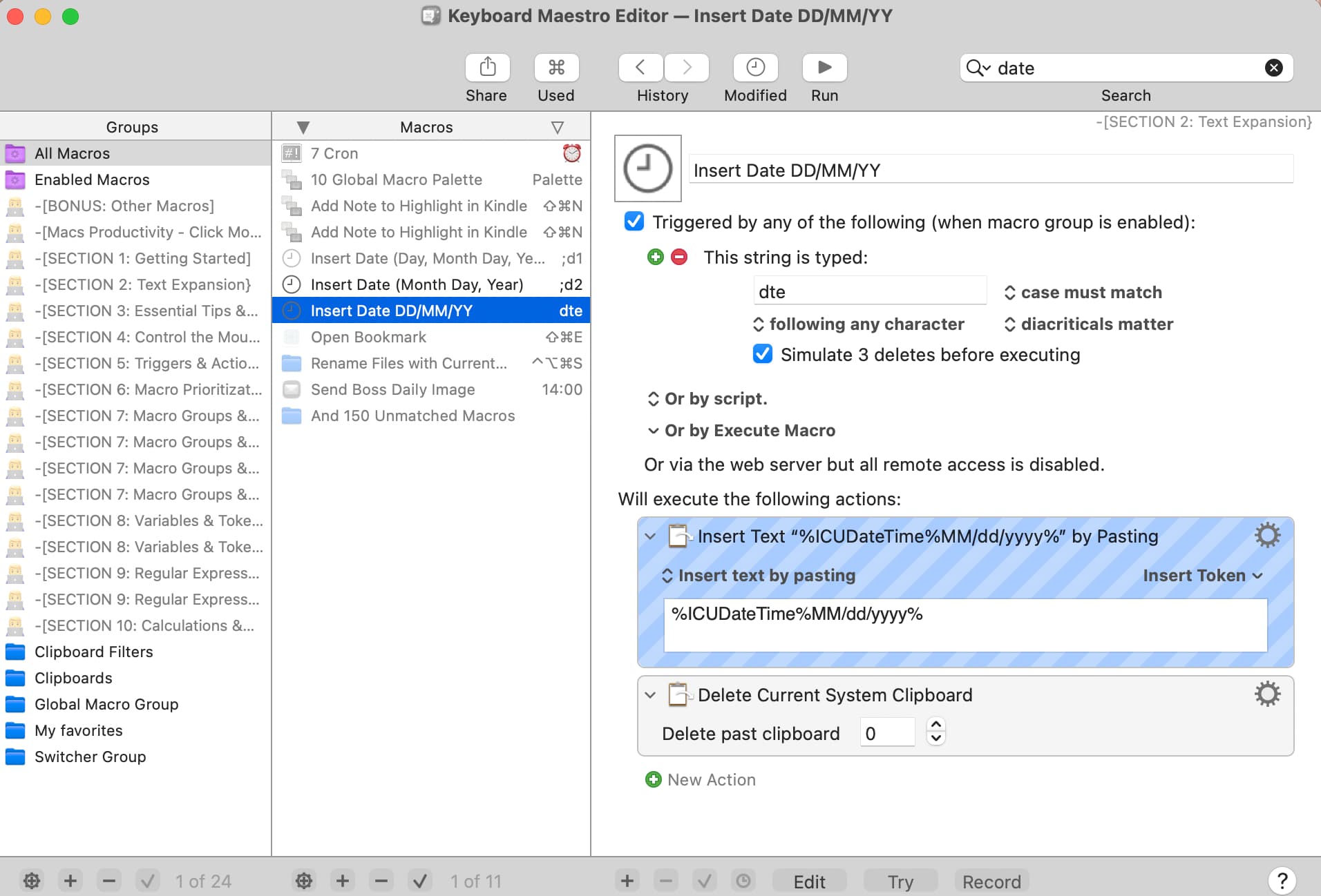 I insert dates all the time. I use seven or eight different formats all the time. My need is best served by having independent macros for inserting the date/time, each assigned to a relatively easy-to-remember typed-string trigger. (All my typed-string triggers start with a period (dot) character. This has served me well since there are very few instances when I type a period followed by a non-space character.) Most of these use the Action "Insert Text by Typing". Some examples below. (I have scores of similar ones, including one for each program I write about — e.g.: ".km" ➞ "Keyboard Maestro ".)