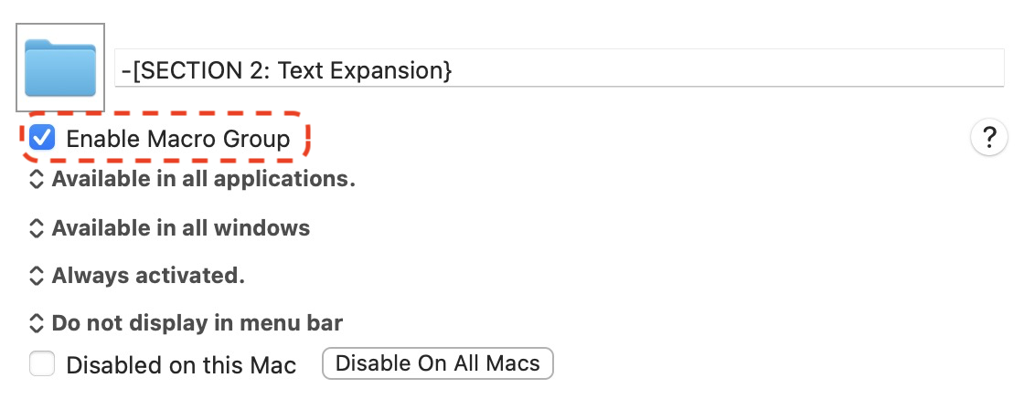 It is also worth looking at the options underneath to make sure the Macro Group is active when you want it to be. You might want it to work in all applications or only in specific applications that you choose from the dropdown list.