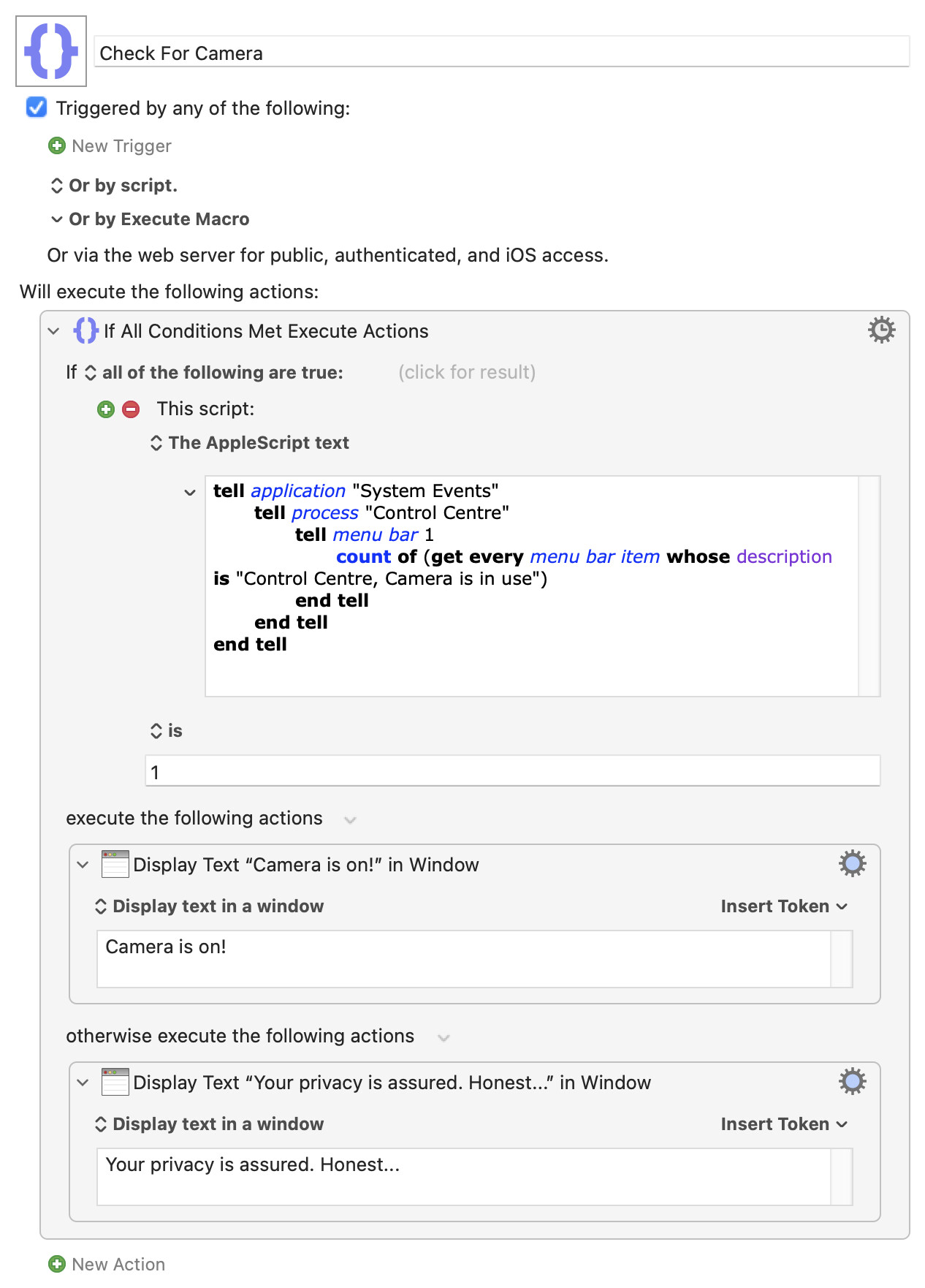 I have a macro that moves a certain window to the front screen if the computer is idle for 5 minutes, that is the trigger. This usually never interferes with my work, but if I’m on a video call it’s annoying. I do video calls in browser so can’t make it dependent on the app that’s in front. So I’d like a condition where if the camera is on it doesn’t run.