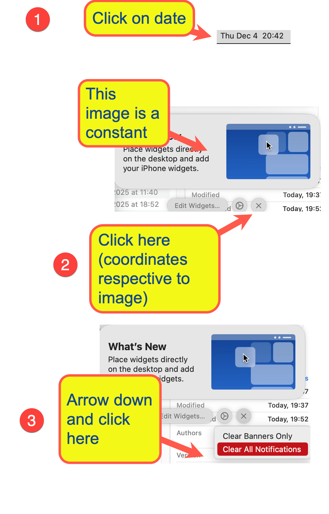 It uses the fact that if you click on the date an image appears, and if you click on the "x" below that image, you have direct access to clear all notifications (using ↓ x 2). At the end, keypress Escape