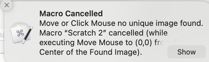 2026-01-27 09:25:32 Move or Click Mouse no unique image found. Macro “Scratch 2” cancelled (while executing Move Mouse to (0,0) from the Center of the Found Image).