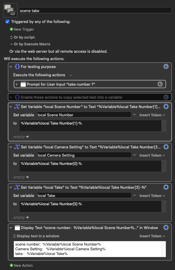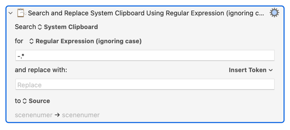 This means KM grabs the name of the take (format: scenenumer-camerasetting-take) where the postion of the player head is within the whole movie sequence, filters out the scene number (by substring), copies this in the clipboard and pastes it in the find window.