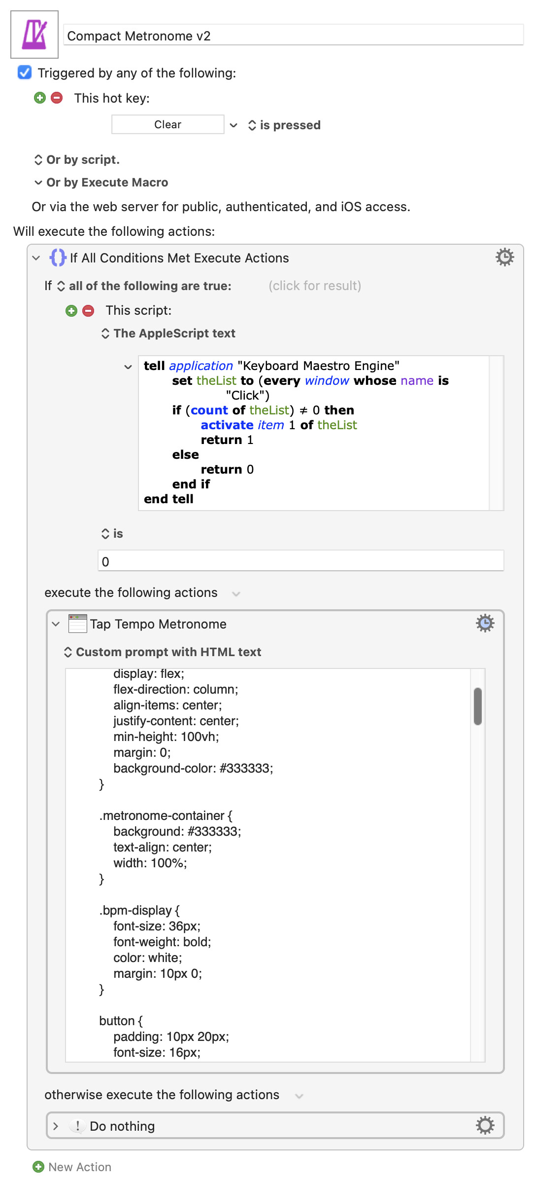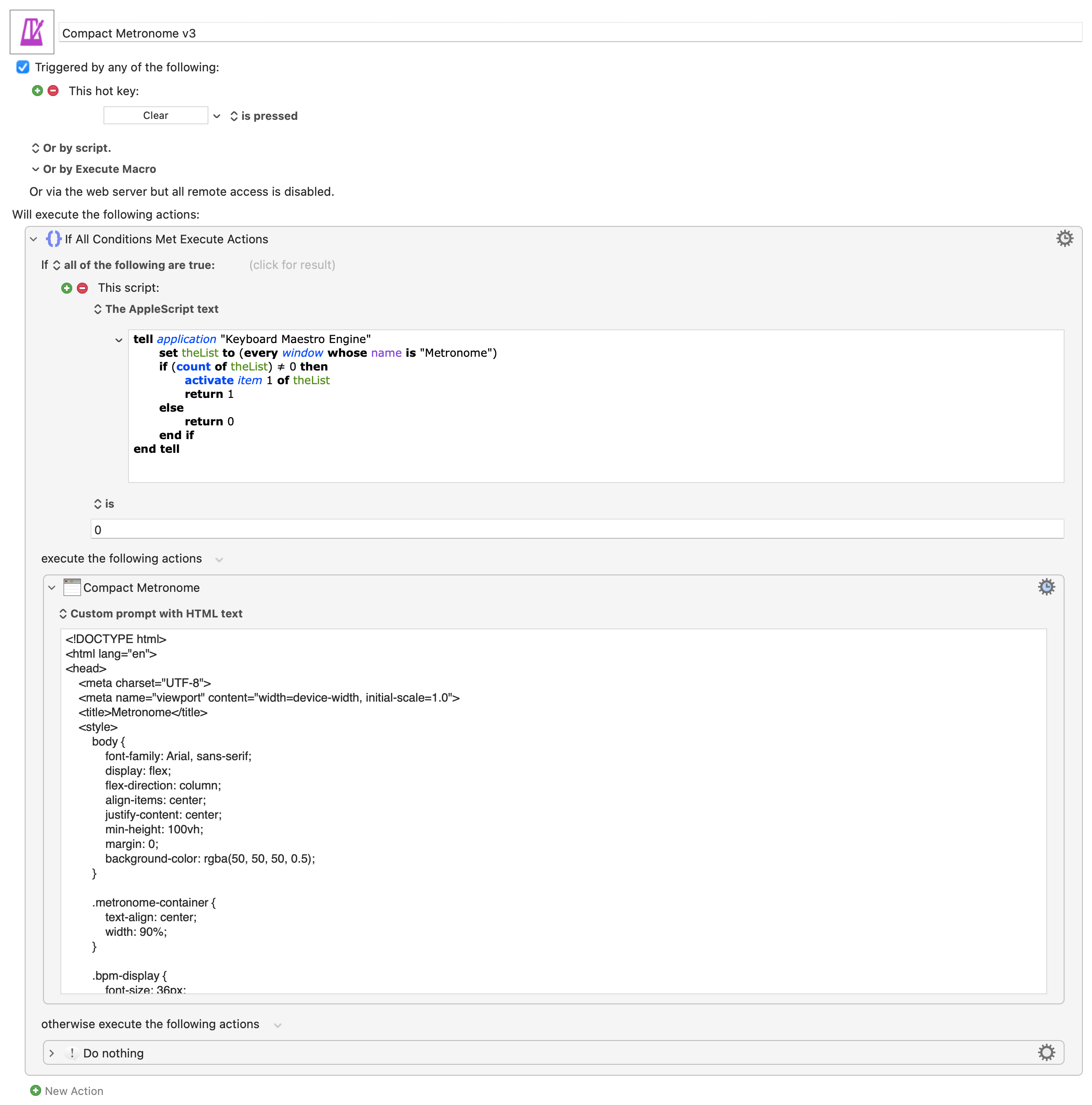 One limitation is that each time the macro is triggered, a new metronome will be opened in a Custom HTML Window. Please do let me know if you can help me change that so that when (re)triggered, it first checks if there is an existing Custom HTML Window and if so gives it (keyboard) focus.