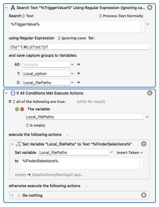 I understand that the current process of launching the macro is i) to select one or more files in Finder and ii) press one of the three hot keys. I understand that the %TriggerValue% is the hot key value (i.e., ⌥⌘C).