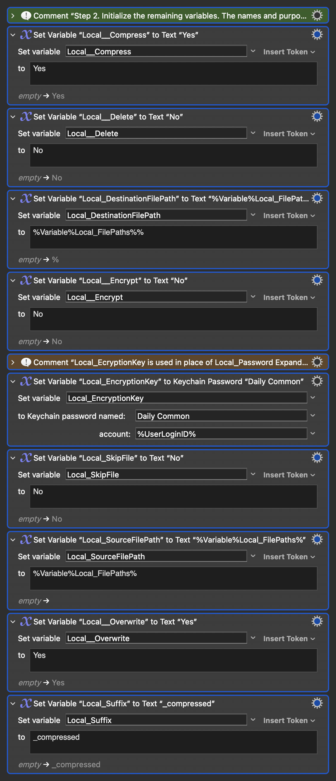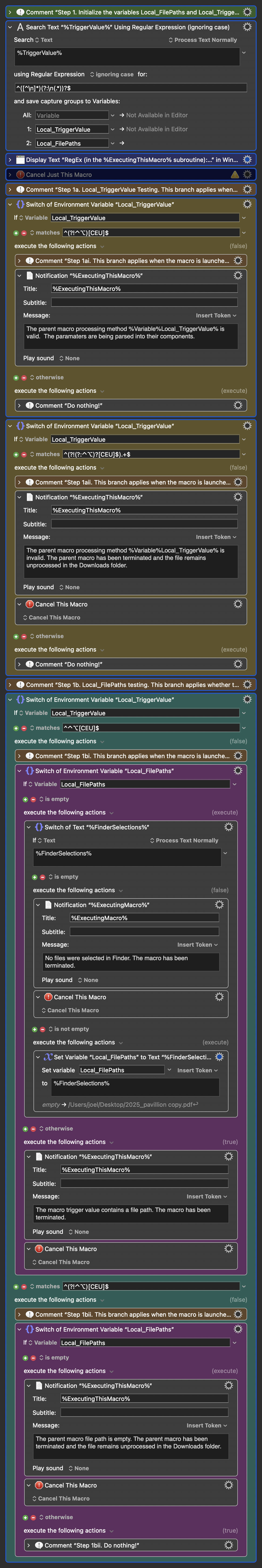 In terms of the variable initiation I book it up into Step 1 (%TriggerValue% related variable Local_TriggerValue and Local_FilePaths) and Step 2 (All other variables). I did this to manage the "focus" and size of the Steps. Though not to my liking, I have added colours to teh different Step 1 sections to make it more readable.