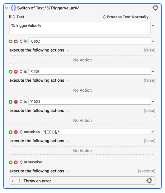 That would also mean that the "Switch/Case" earlier would still cover all options, even if you were determined to use ⌥⌘ in your sub macro parameter -- just change the "match" to ^(⌥⌘C|⌥⌘E|⌥⌘U)\n/.*