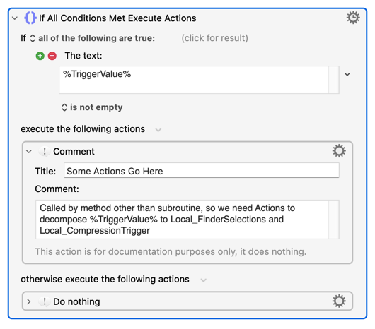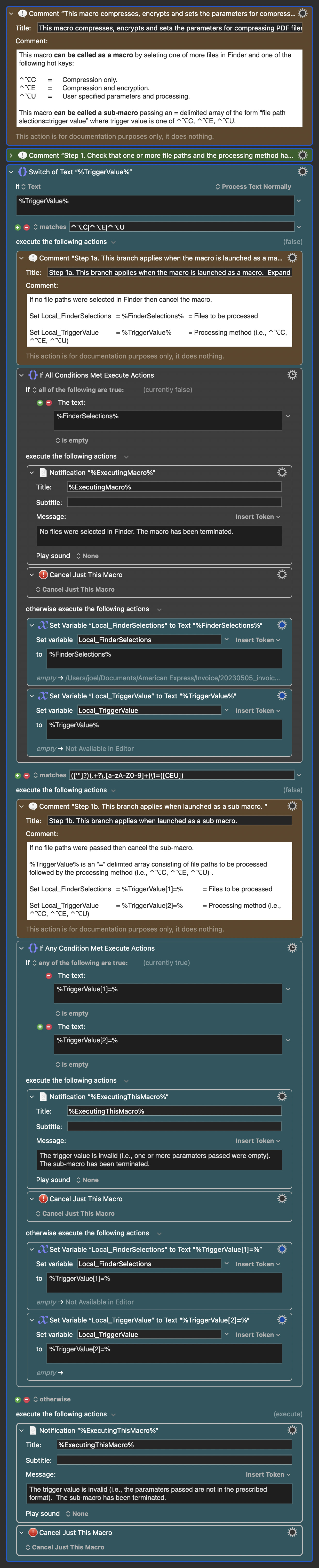 Would appreciate guidance and help as to a better way to repurpose / use the macro in the Hazel like subroutine noting that to do so I need to i) pass the trigger type (i.e., C, E or U) and ii) replace the %FinderSelections%.