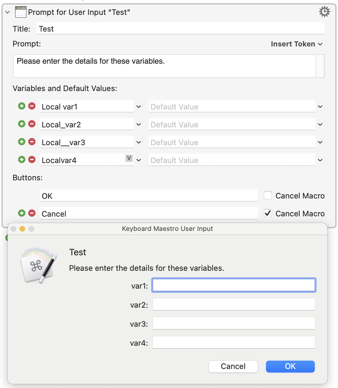 I will check but it is my understanding that one uses double underscores for variables that appear in Prompt For Input actions so that the "Local" does not appear. I will re-read the WiKi to make sure this is correct and adjust accordingly.