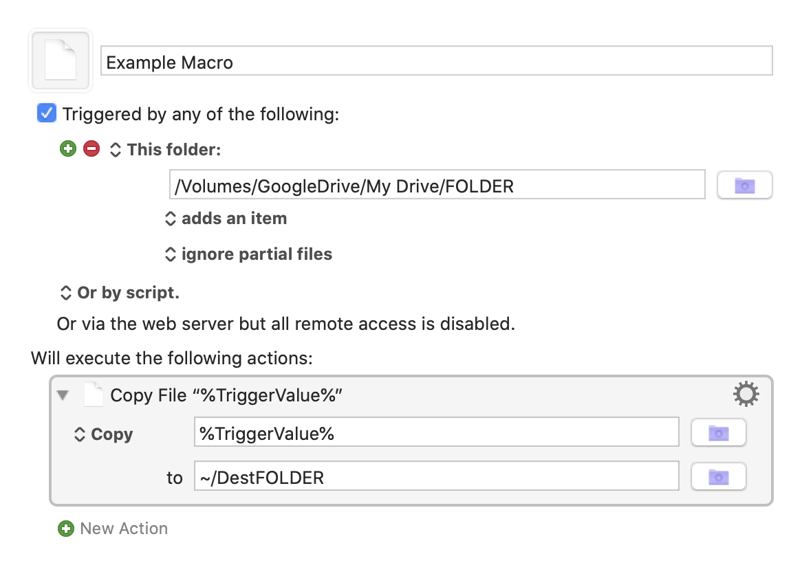 As of now I still haven’t been able to copy a file from the main HDD to the Google Drive folder, regardless of sub folders etc…I may have made a mistake in my macro, should I first do: