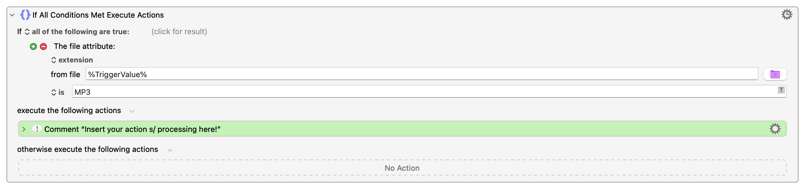 The if statement comes first so that only MP3 files are moved. Place your actions where the green comment box is.