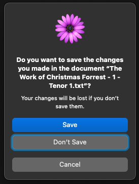 Note that don't save is highlighted. Pressing the space bar closes the file without saving. Pressing tab and spacebar, or pressing escape, closes the dialog. Pressing shift tab and spacebar will open up the save dialog.