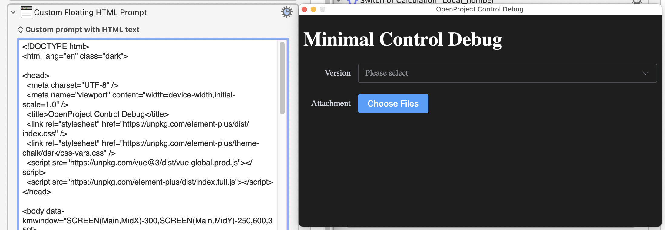 That's part of what you want. What about the rest? Is the HTML static, or dependent on KM variables? Does the choice in the "Version" field then alter form options, or is it input data only? After you've chosen some files, what then?