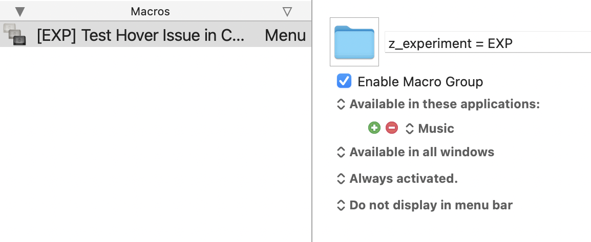 That is interesting (if your Music.app is also (one of) the app which you have specified in KM as the app, which must be running to activate the macro group holding the chp. I assume that there is no difference on M1-Macs. Thus there is no need to check also on your M1. But it gives me a new starting point to think over why in my case the Music.app does not loose its hover-functionality.