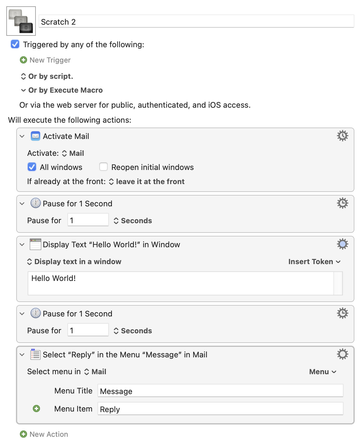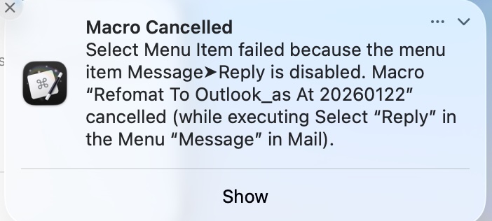 As those following this thread know, displaying the raw text in a window (which was part of the debugging exercise) resulting in the macro failing because the menu commands Message > Reply was not available per the following error message.