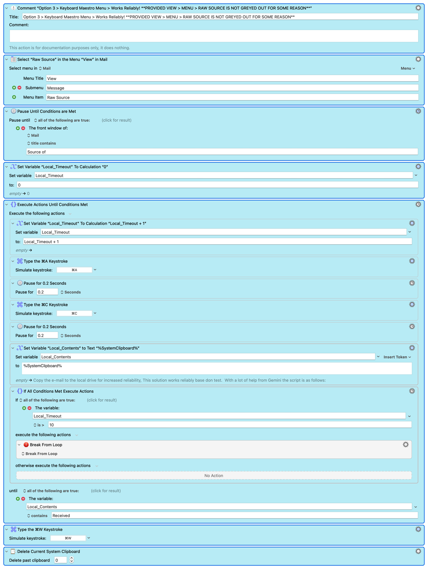 Keyboard Maestro: Delay / pause the assignment of the %MailRawSource% token to give it enough time to load. I could not get this one to work but the what I tried is as follows but I suspect this too is conditional on the Raw Source is available (i.e., the Raw Source is not greyed out which i) it is from time to time and ii) suggest -- at least to me -- that something in the chain is slow).