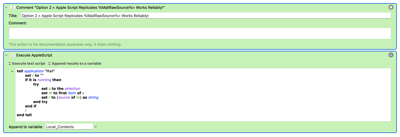 a. Why does the %MailRawSource% have a timing issue while the Apple Script that replicates it does not? I would very much like to understand this?