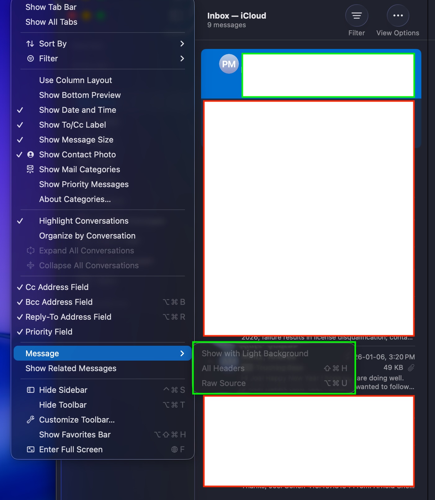 c. Why would the View > Message > Raw Source be greyed out from time to time?