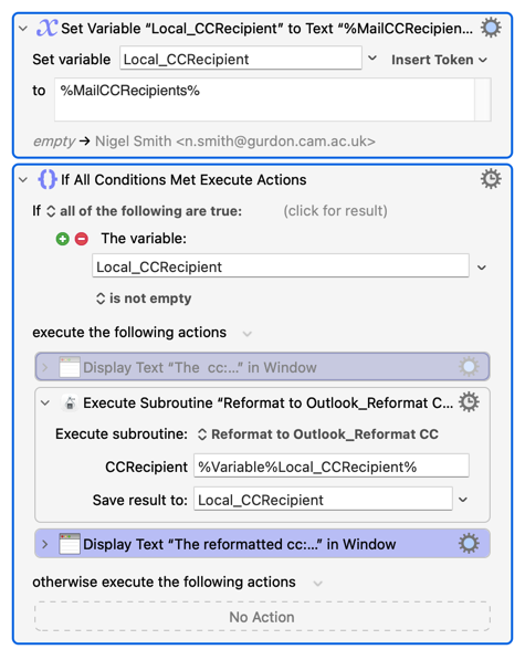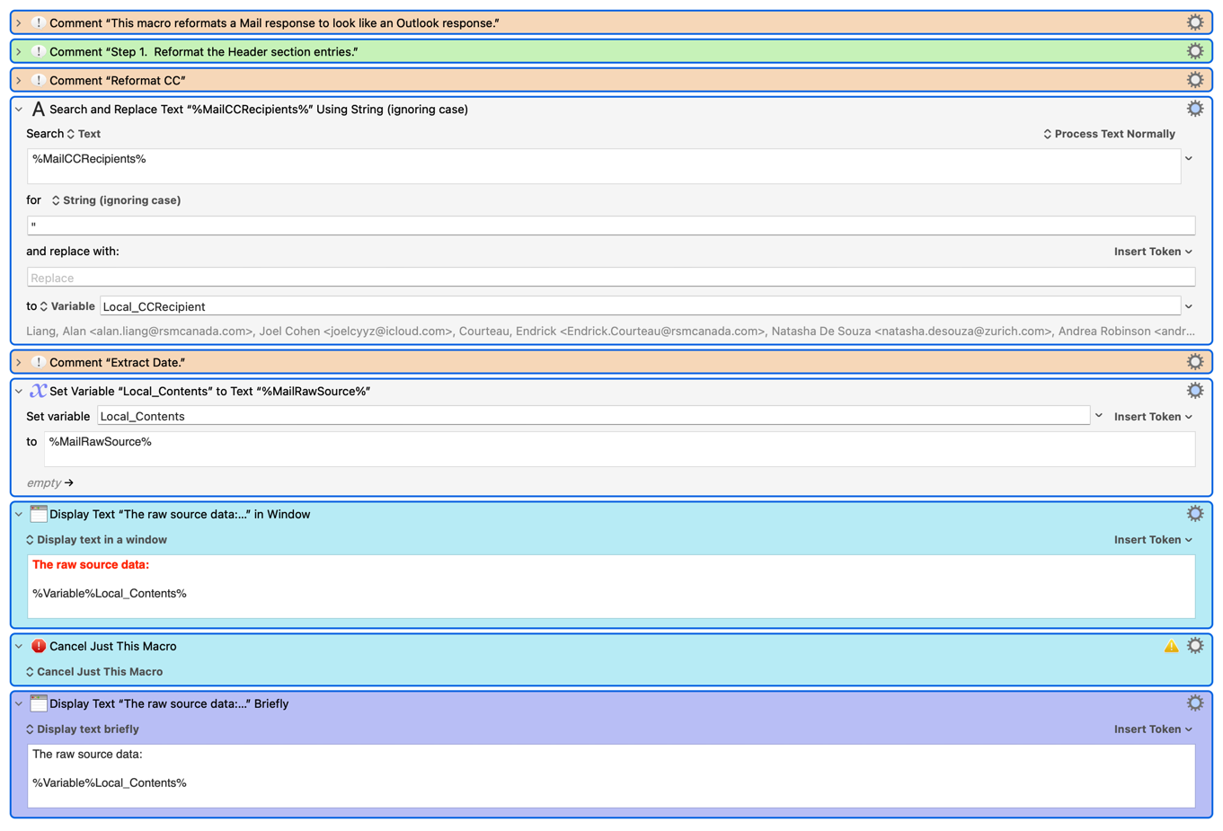 The macro appears below noting I have modified it to cancel / stop after reading the %MailRawSorce% token and displaying the Display Text window to make testing easier.