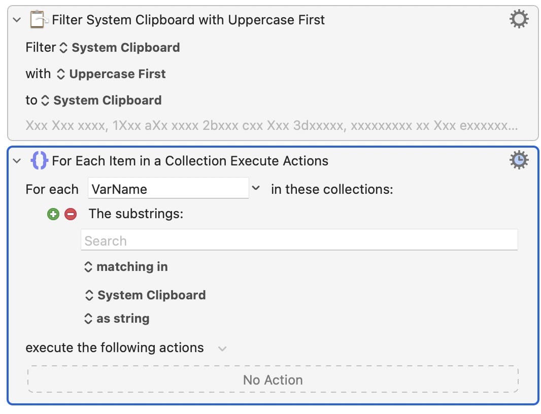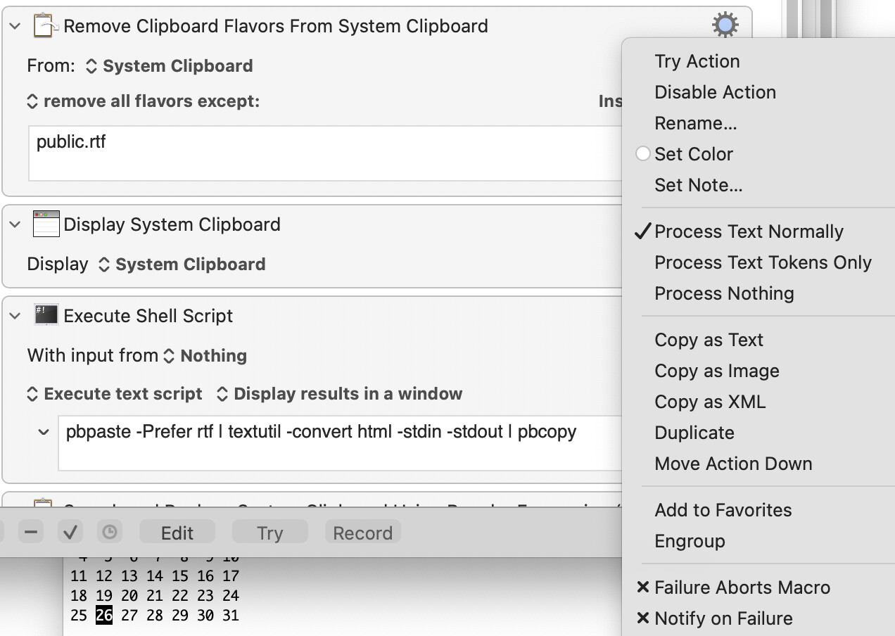 My first thought was to use the Filter System Clipboard or For Each Item actions but it seems they do not work on styled text. Neither does Regex, it seems.
