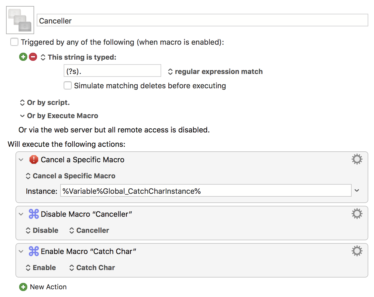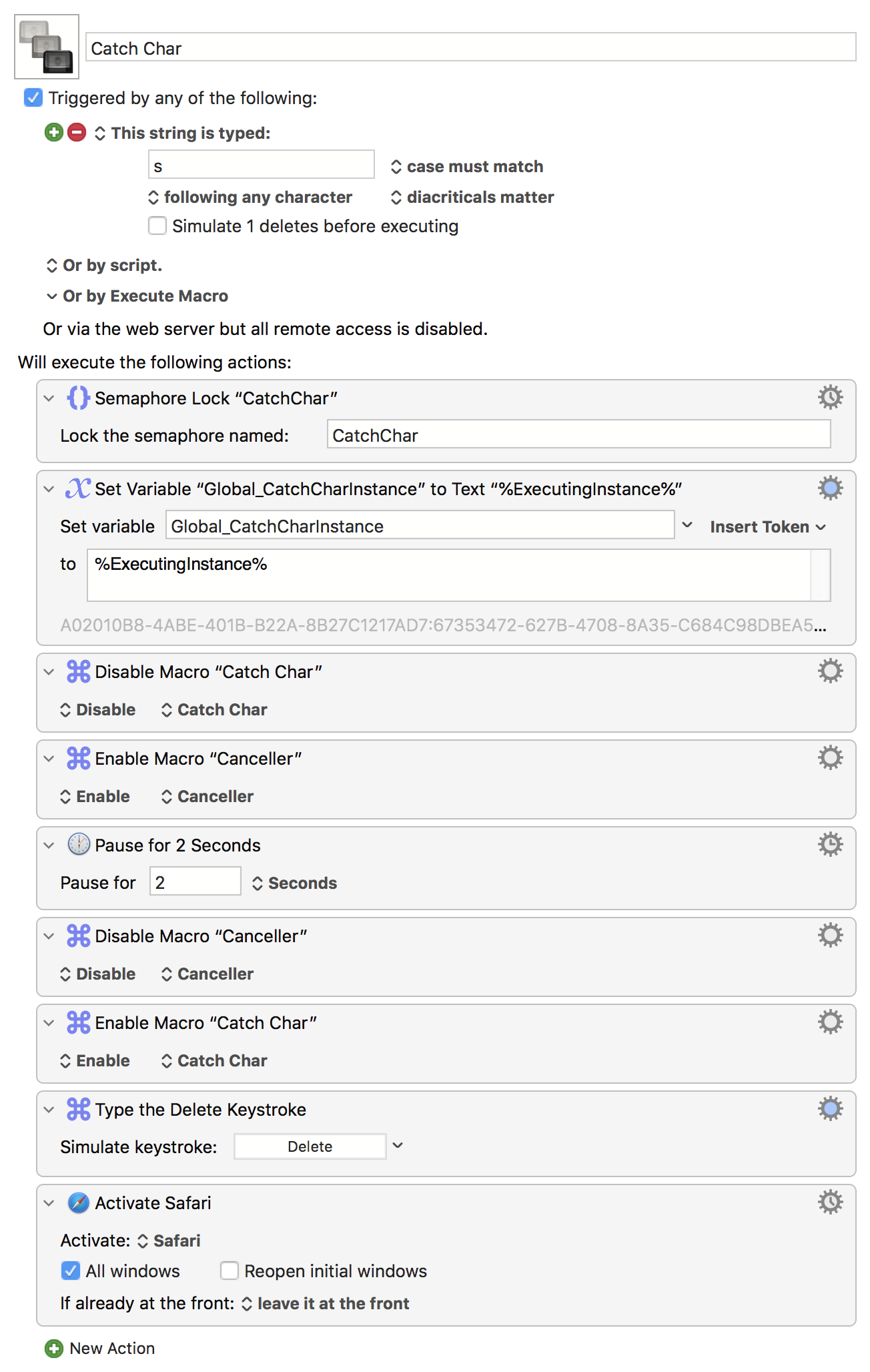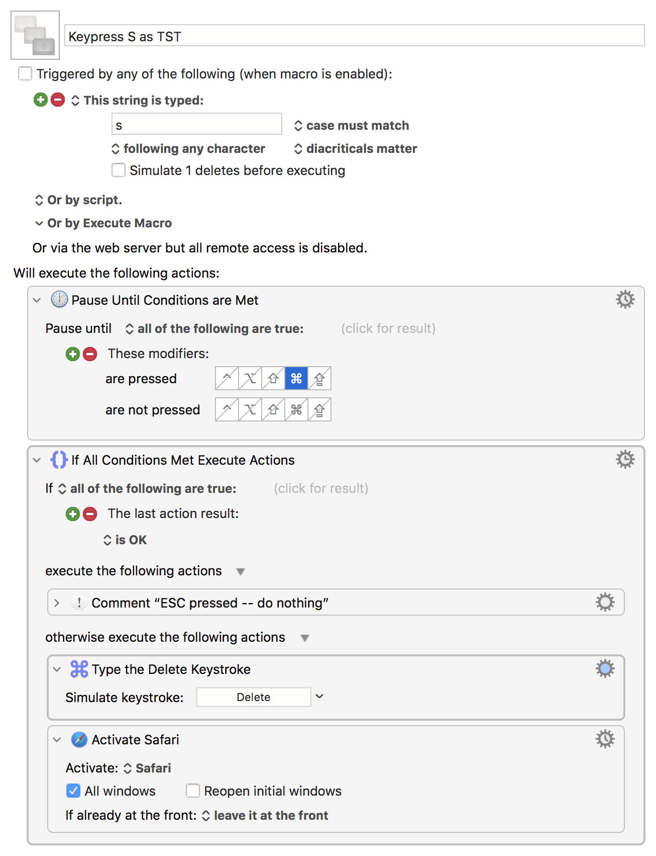 You could also do the same, but using "s" as a typed string trigger. That would get you built-in case sensitivity (if that matters) and you could choose whether to resend the "s" on cancellation or to not simulate the delete and then do that as an action in the "not cancelled" branch (I've done the latter):