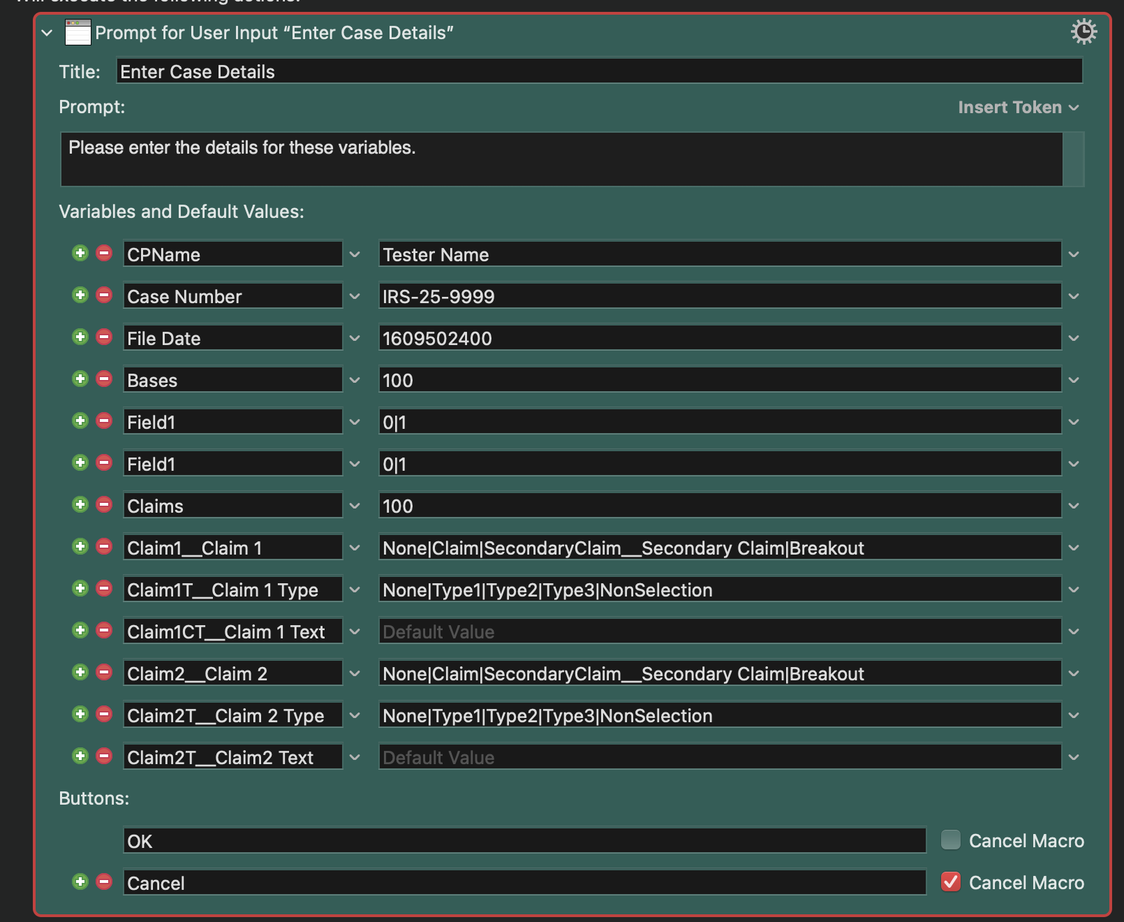 I am hoping someone can point me in the right direction. I am creating a macro that will build a document for me based on the variables in a user prompt. I am having some trouble finding documentation on what it is I want to do. The three fields at the bottom of this sample prompt are called claims. My document may have as few as one claim, requiring three questions per claim or an infinite number of claims. I was thinking about a button at the bottom that asks if you want to “add another claim.” Then it creates a new prompt with those three questions and creates the dynamic variable based on the number of times a new claim was added to the prompt. I have not been able to find any example of what I am looking for, but someone has had to have done something similar to this. Can anyone point me in the right direction to an example?