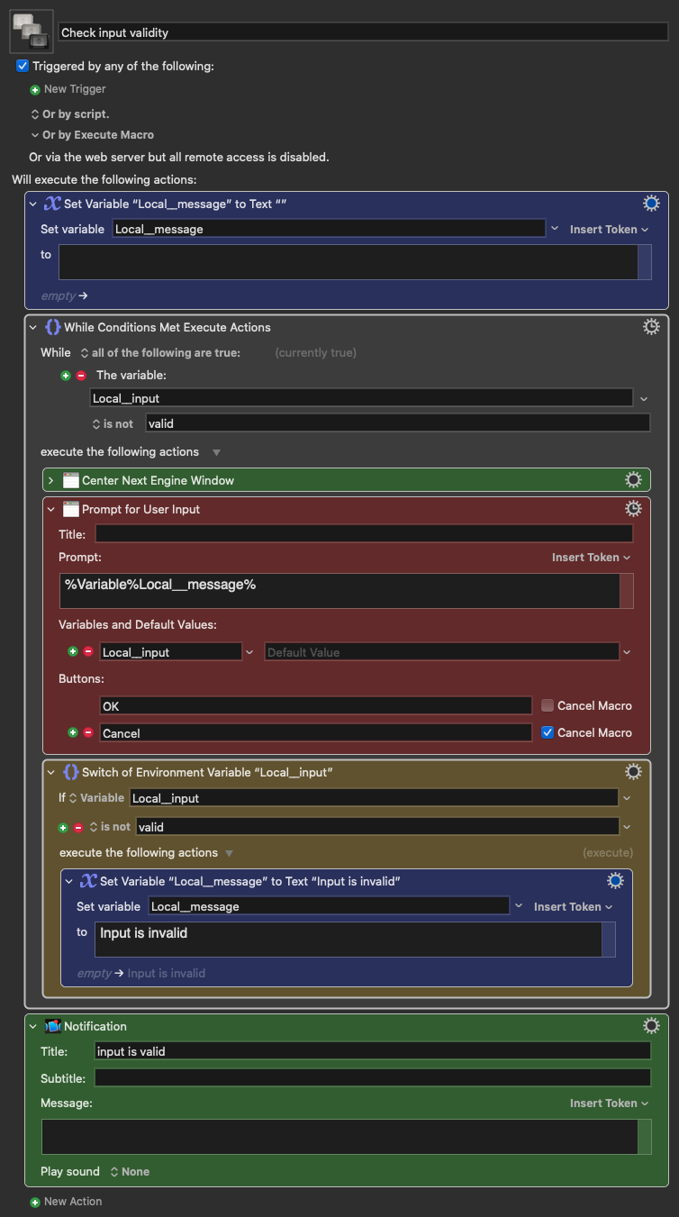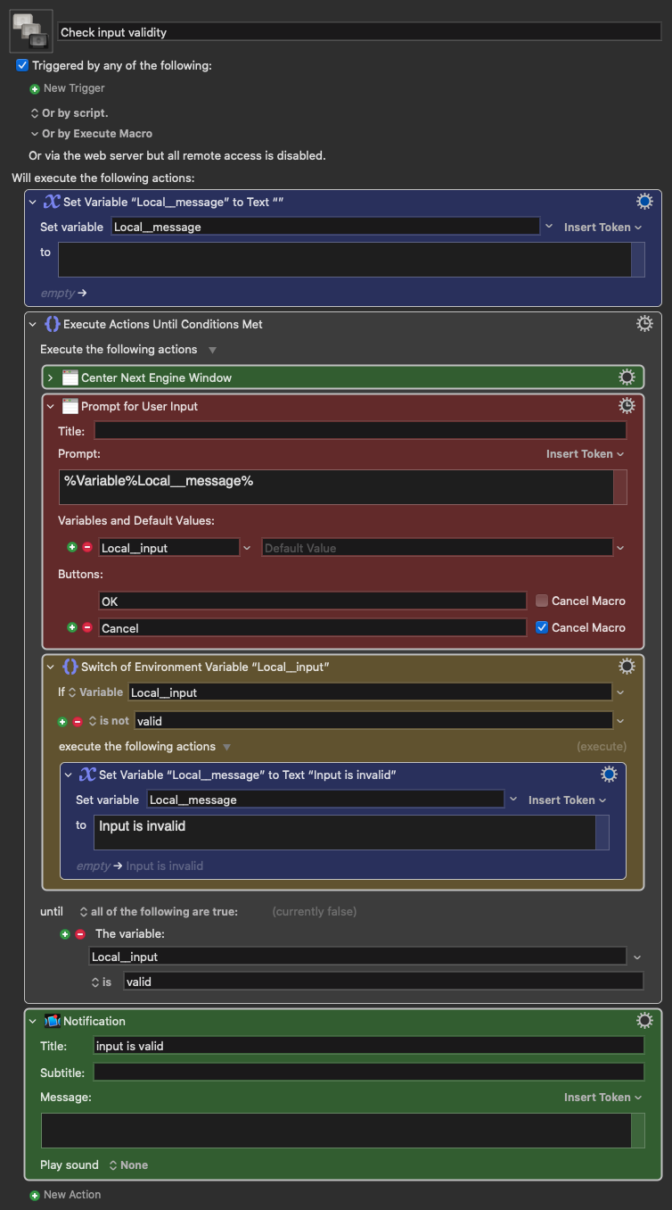 Then, once it runs the prompt, if the input is valid, it does nothing to the variable, if it's false, changes the state of the variable to include the message "XYZ is not valid. Try a different one", so when I run the macro again using the Execute Macro (This Macro), it will now show the message. Then, once the macro fully runs based on valid input, I can set the global macro to empty again.