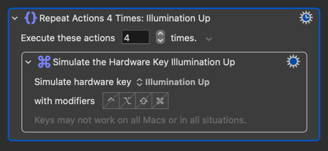 MacBooks have backlit keyboards built-in. It would be helpful if we could automate switching them off, when using an external keyboard for example. There doesn’t appear to be any actions for controlling the backlight.