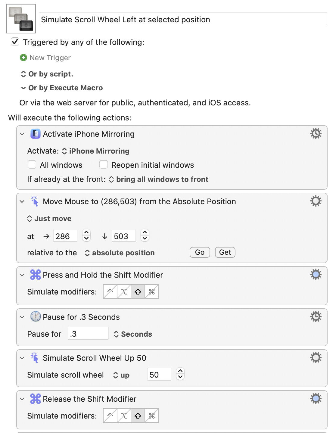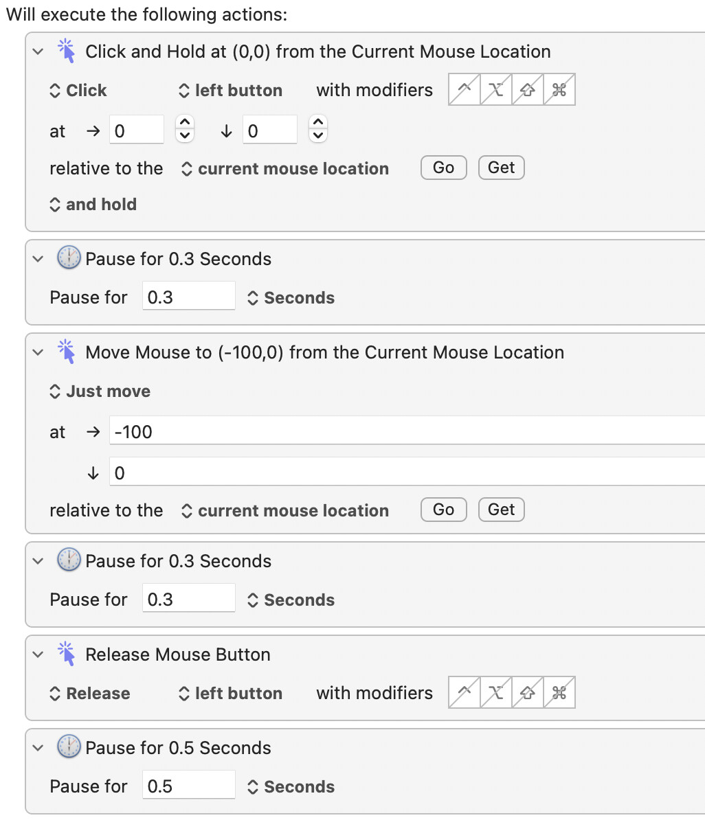 Extra details on this use case: I have an iPad app running on MacOS - Blink. Blink requires a left gesture to show a trash can to delete a video. Since this is an iPad app running on iOS, there are no alternate ways (keyboard) to delete the video. I'd like to use KM to delete a video. (Note - if I click the video and it plays, a trash can appears at the end. I can click that and delete but it takes 10+ seconds)