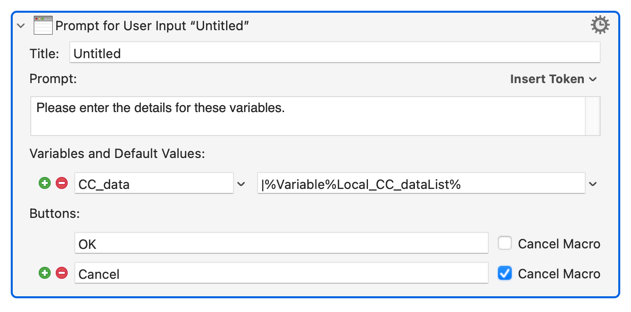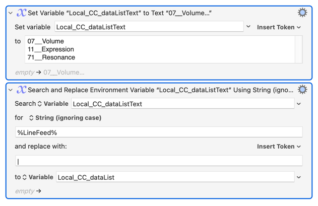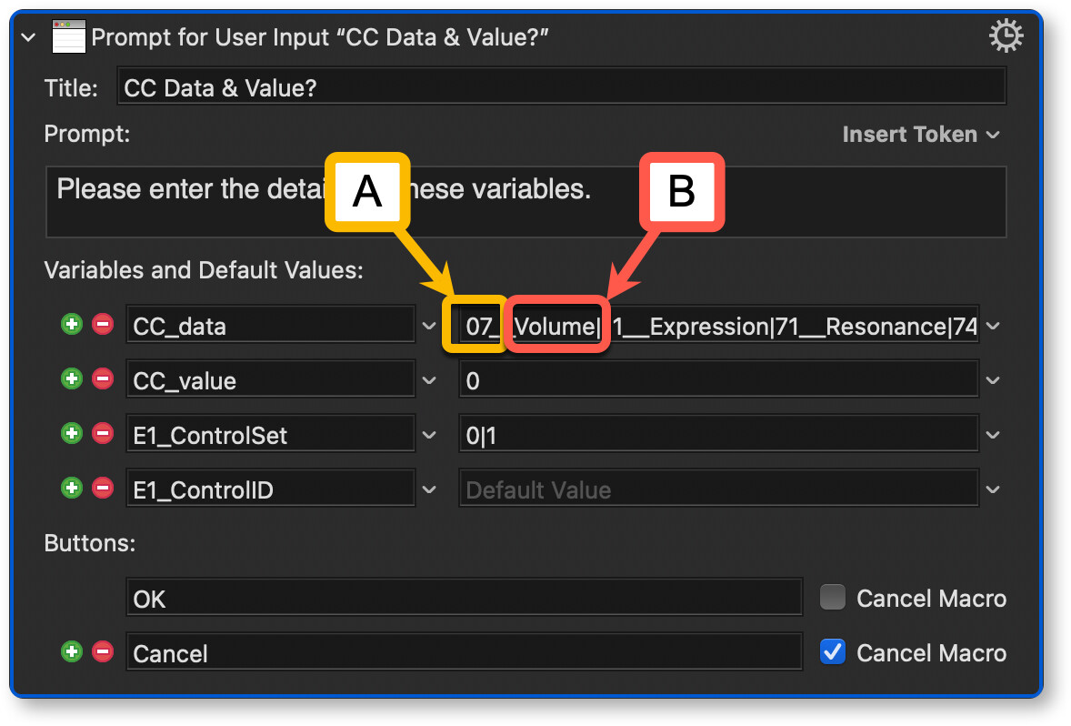 Back to my example. In my "Prompts…", I want to use regular parameter names, some of which have already been mentioned—for example, "Cutoff", "Resonance", "Expression", etc. The corresponding controller numbers are "74", "71", and "11". I also include information about the MIDI channel on which the data is being sent and the value. My inserted string (simplified somewhat) looks like this: