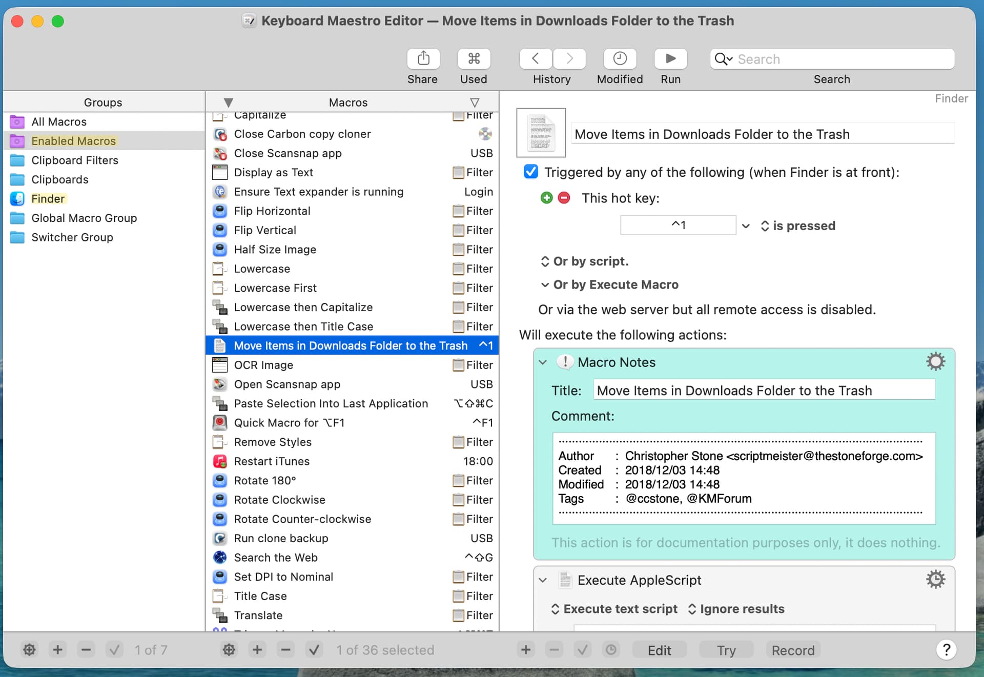 Hi guys, I have been using Christopher Stone’s AppleScript macro to move files from the downloads folder to the trash, I had a problem on my Mac and now the hotkey only works when the finder is selected, previously, it worked everywhere.