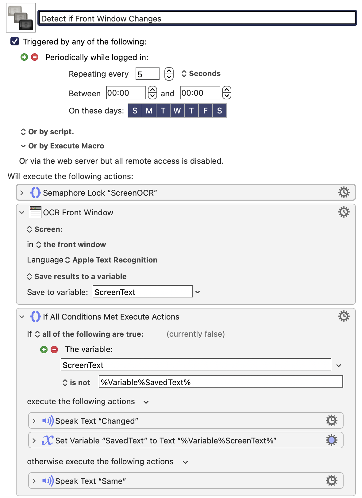 Okay, here's a screenshot of a very simple macro that monitors the front window and, every 5 seconds, says "Changed" if it believes that the window has changed. You can reduce the time to 2 or 3 seconds if your Mac is fast enough, or you can put this into an infinite loop.
