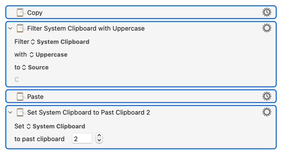In this case I want to convert the selected text to UPPER CASE. I don’t want to use AppleScript, but the power of KM. That should work with the Filter action right?
