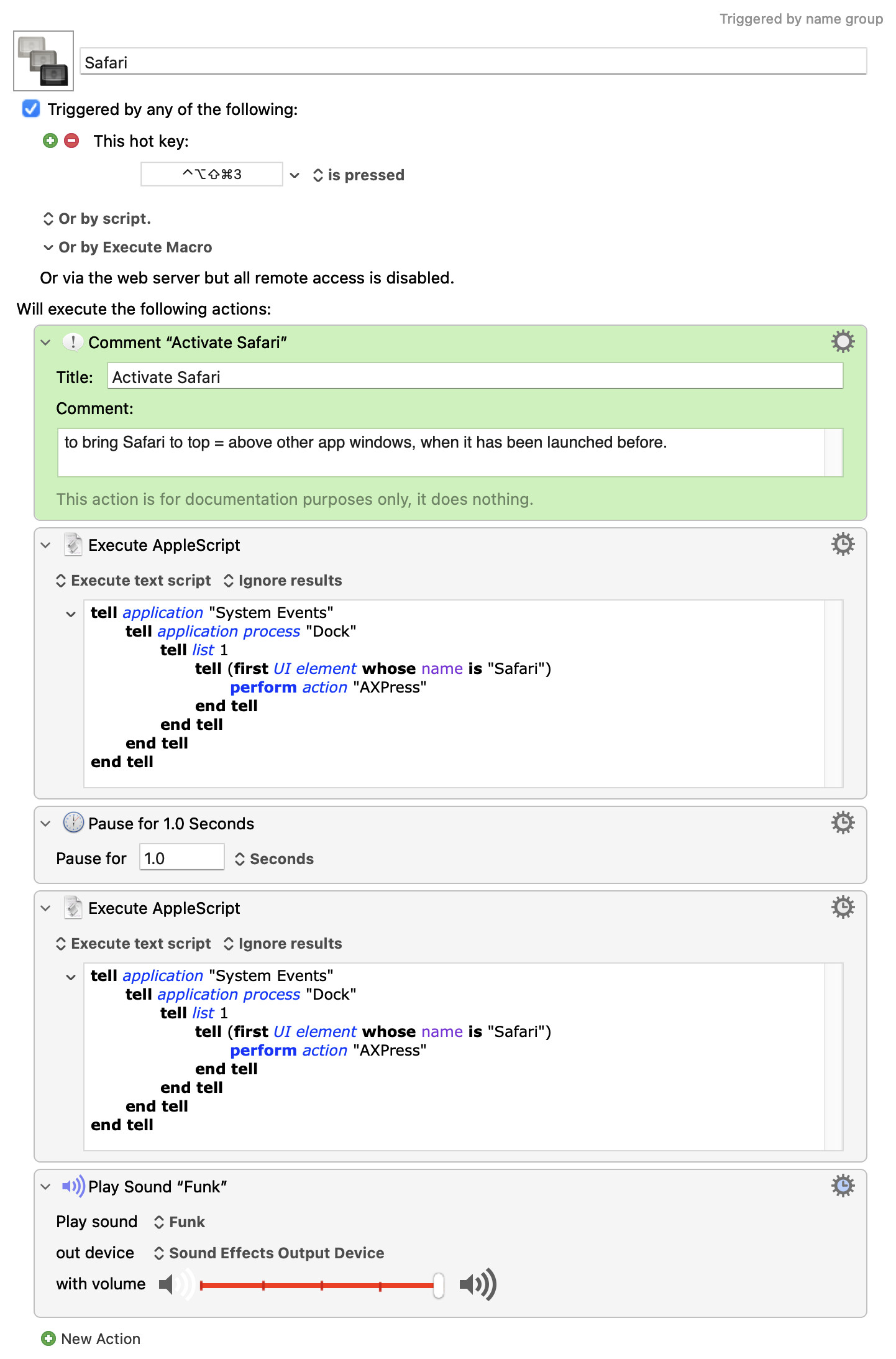 However, lately the original macro with one AppleScript is not enough anymore (for Safari or other apps to come up to 'Focus state'), it may be because of the new macOS Tahoe or maybe I have too many spaces (5 or 6).