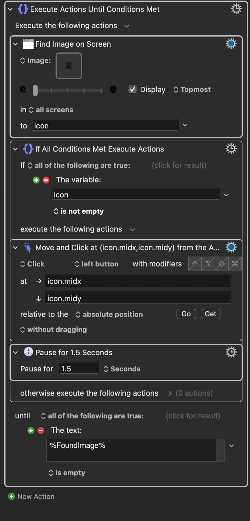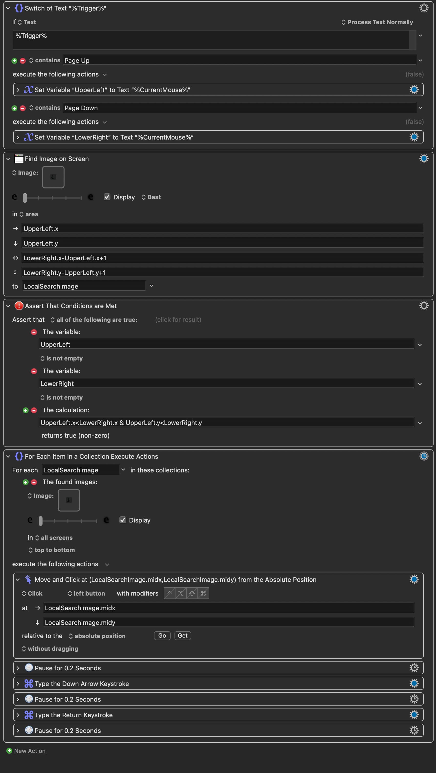 Sorry I am stupid and need some guidance on the next step . I am assuming I have to use the “Find Image on Screen” action to save the image as a variable first. Then use an If clause, where if the variables “UpperLeft“ and “LowerRight“ contain the image (variable name of the image), then click on it? The problem is I don’t think it is possible to input two variables into one field (“UpperLeft“ and “LowerRight“) and it’s likely that’s not the way to do it either. So please! Enlighten me.