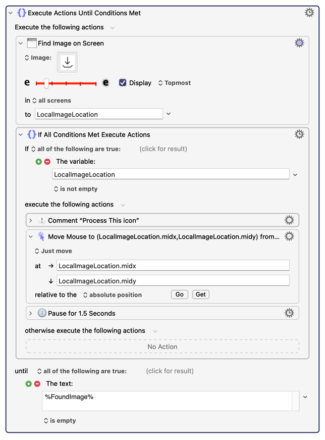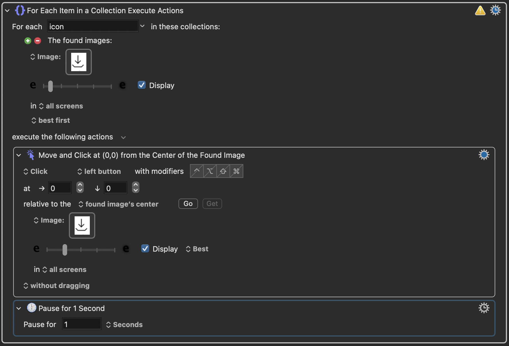 Bear in mind that if the screen changes while this loop is running, you may get unpredictable or invalid results. So another way to solve this, slightly more reliable, would be like this. Notice the use of Topmost in the first action. This will find the topmost icon, process it, and then assuming that the icon has disappeared, the next run of the loop will find the next one that is "topmost" which hopefully means "second from the top" prior to the first one being clicked on. If the icon has NOT disappeared, then we can use the previous solution above.