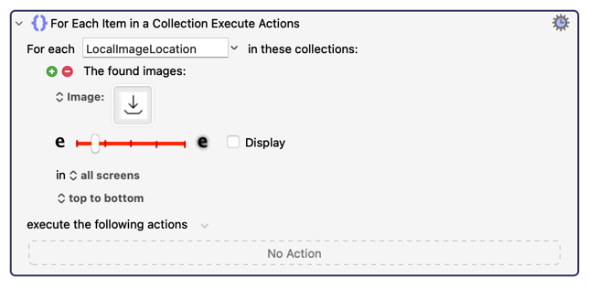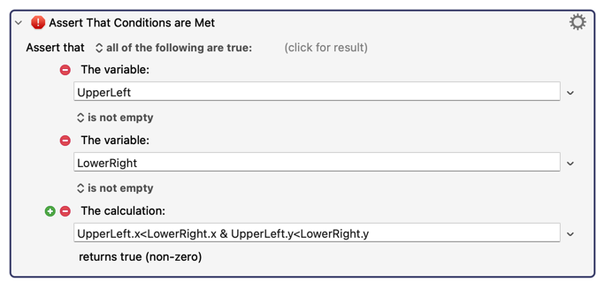 Also, and this is a big one, your loop logic is incorrect. The loop has "in all screens" set for the found image search area. That's the place you are supposed to change to "in area". You don't need the Find Image action at all. So (a) delete your Find Image action, and (b) fix the For Loop to use "in area" which is where you put your four expressions. And don't forget to put the Assert and the For Each into its own macro with its own trigger.