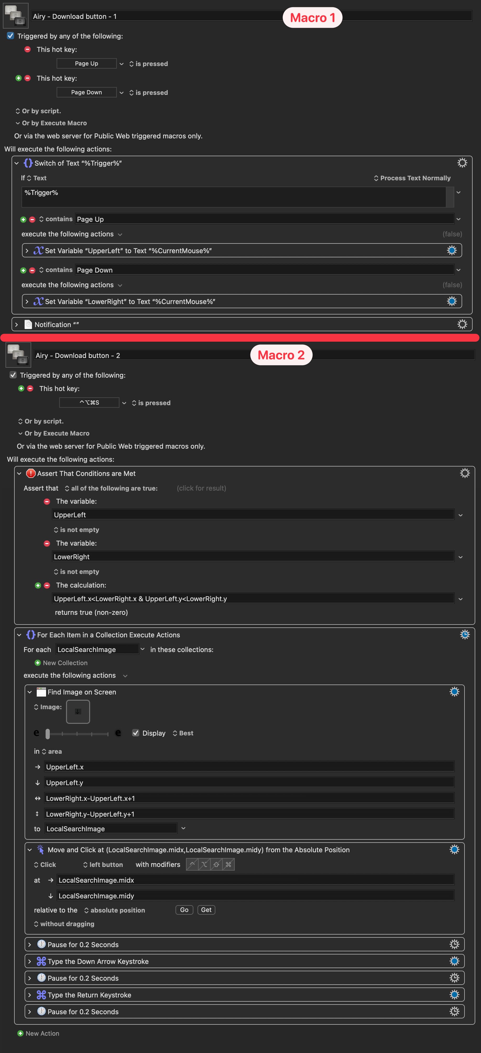 Ok here is the next problem. It doesn’t wait for me to press both keys to initiate the actions. I pressed PageUp, then it already jump into action, which means it didn’t click on the images only in a specific area, it clicked on all the images on the screen. I tried to insert a “pause until the key PageDown is down” action but that didn’t work (not shown below). What do I do now??