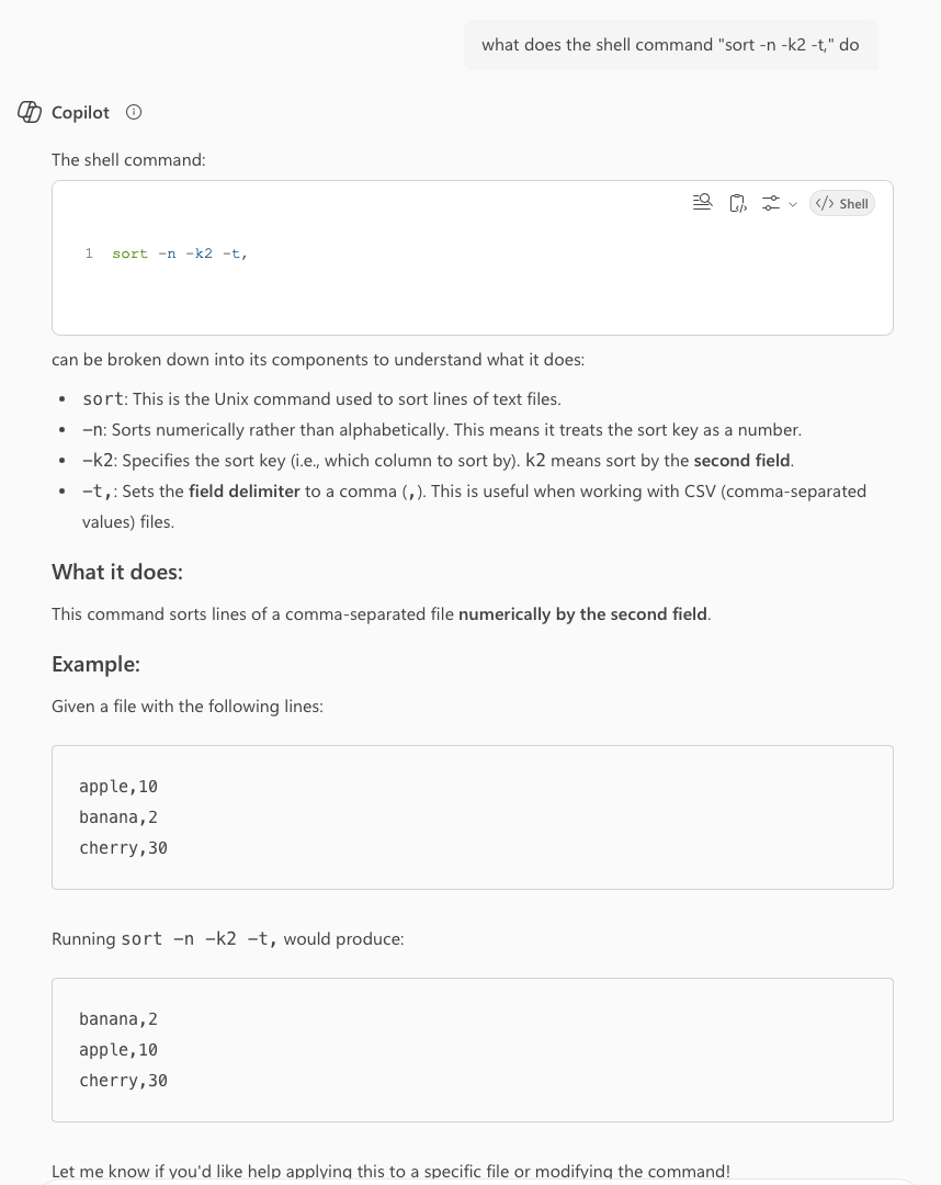 And for understanding scripts you see here you can go the other way -- "what does the shell command "sort -n -k2 -t," do". LLMs are quite good for that, particularly if you break longer scripts into smaller chunks to see what each part does. For example (my second ever use of Copilot -- go me!):