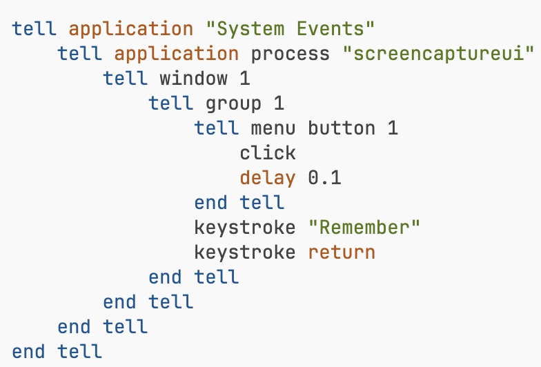 I need to know “screencaptureui” so I can write scripts like this to find what the buttons are called, right? A whole world of control opened up to me once I ran this script, but without “screencaptureui” I never could have gotten to that world.