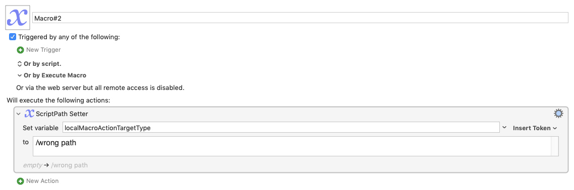 Macro #1 dynamically sets a variable ScriptPath to a certain path. Macro #2 has an action that hardcodes that path by setting the variable to a literal string of text.