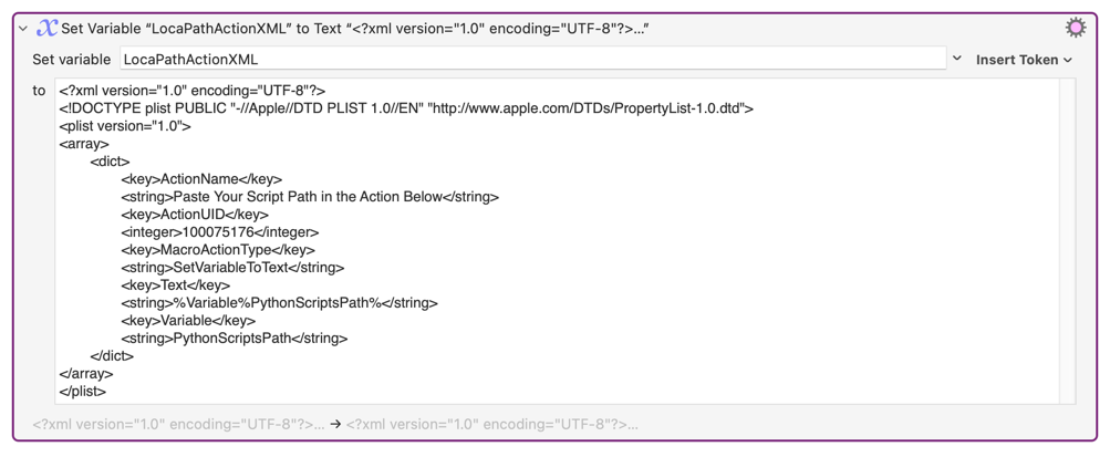 I see. So if I have this action XML, how would I use AppleScript to add it as the first (or last) action to the macro called “Set Keyboard Maestro ENV Variables”, which is in the same macro group as the executing macro?
