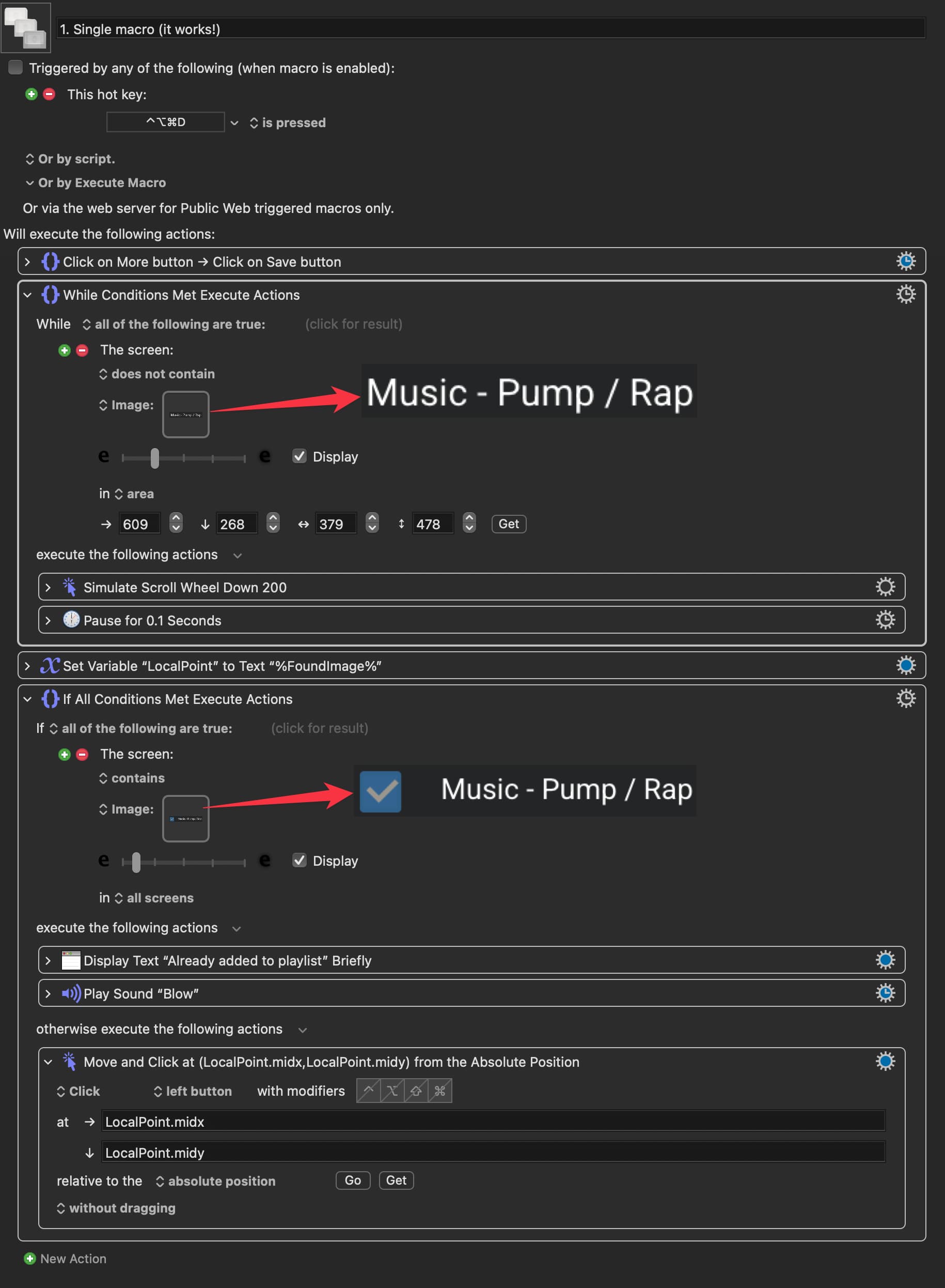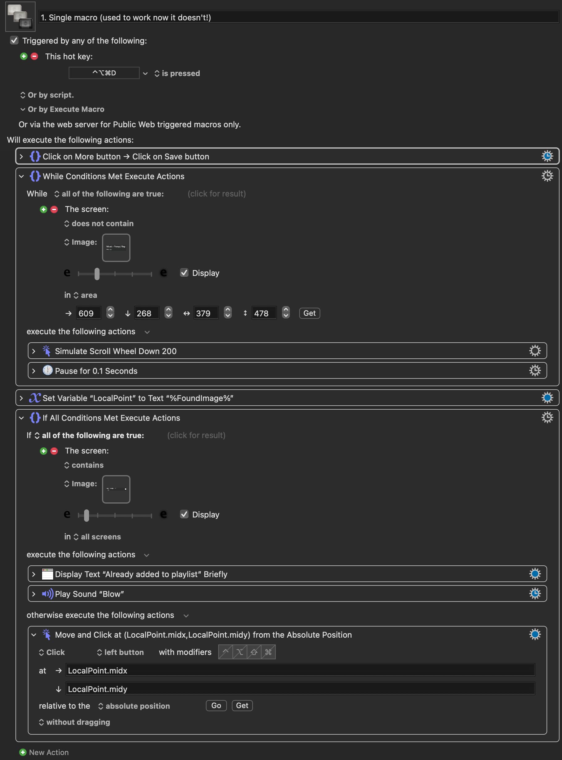 I have a macro that opens the “Save video to…” menu on YouTube, scrolls through the playlist list until it finds the target playlist (using a Found Image action), and then checks whether the video is already saved to that playlist — indicated by a checkmark next to the playlist name (again, using another Found Image action).