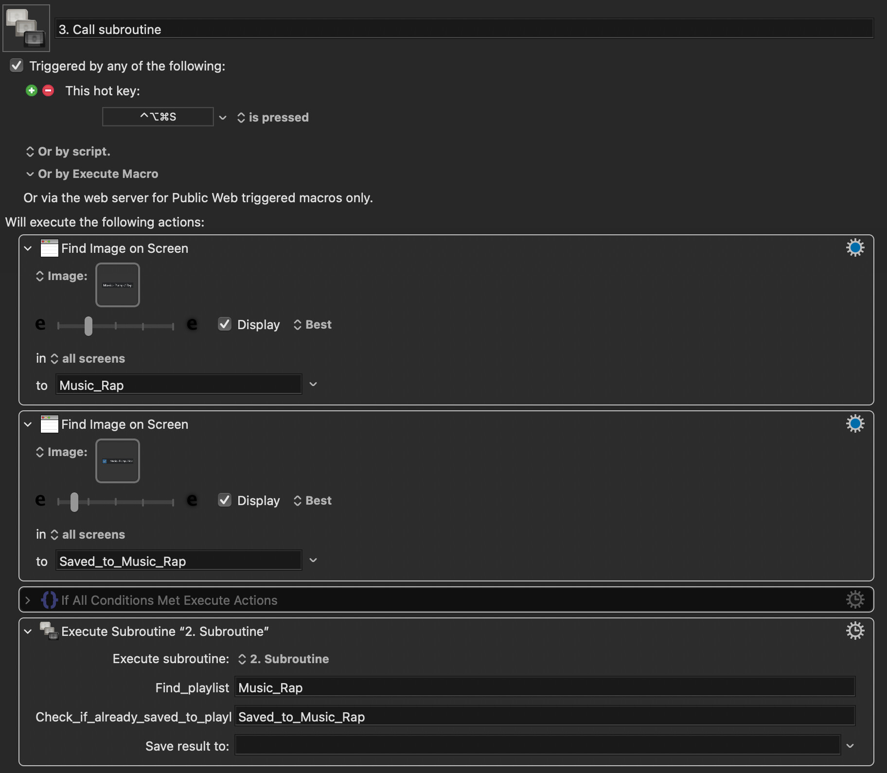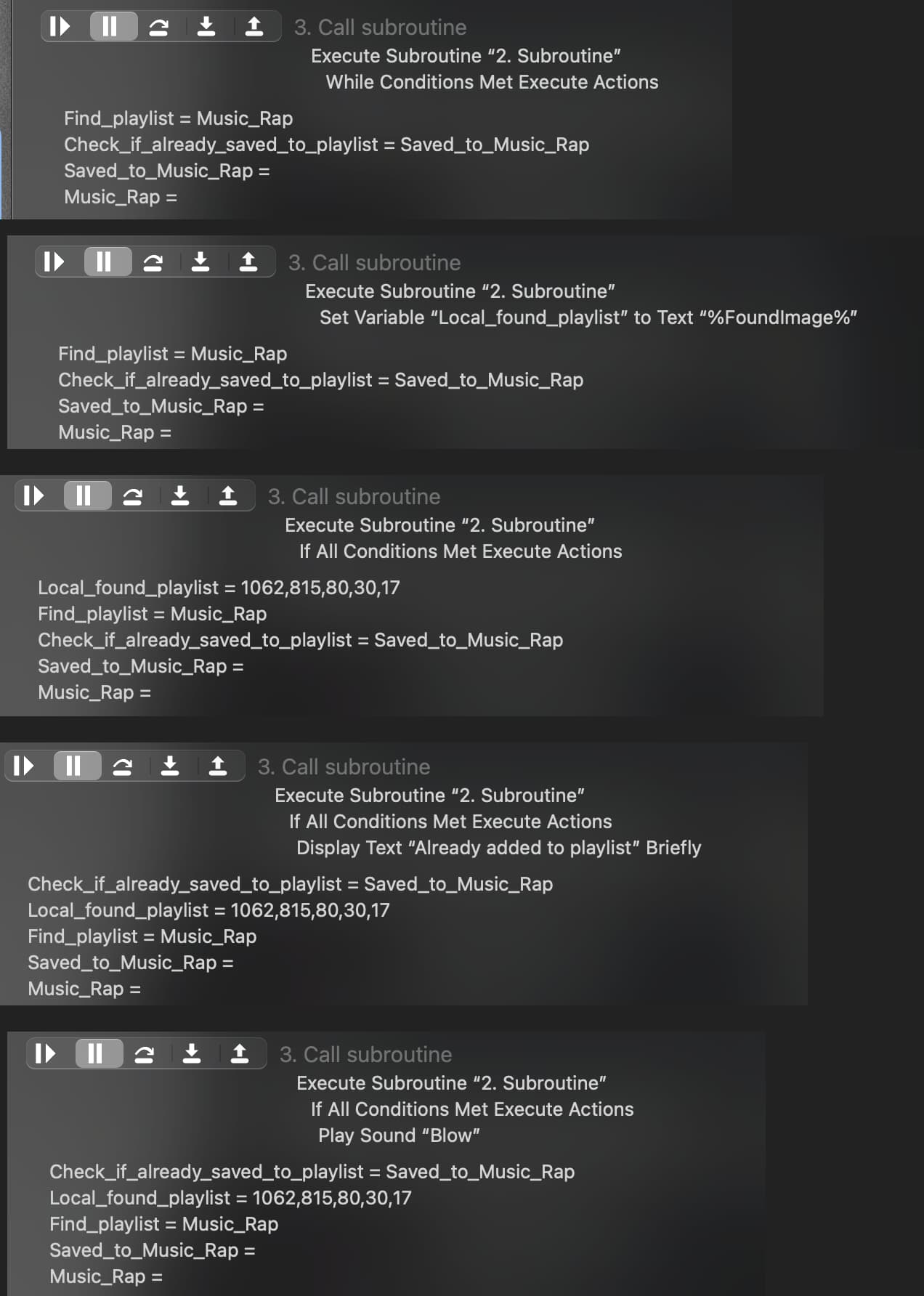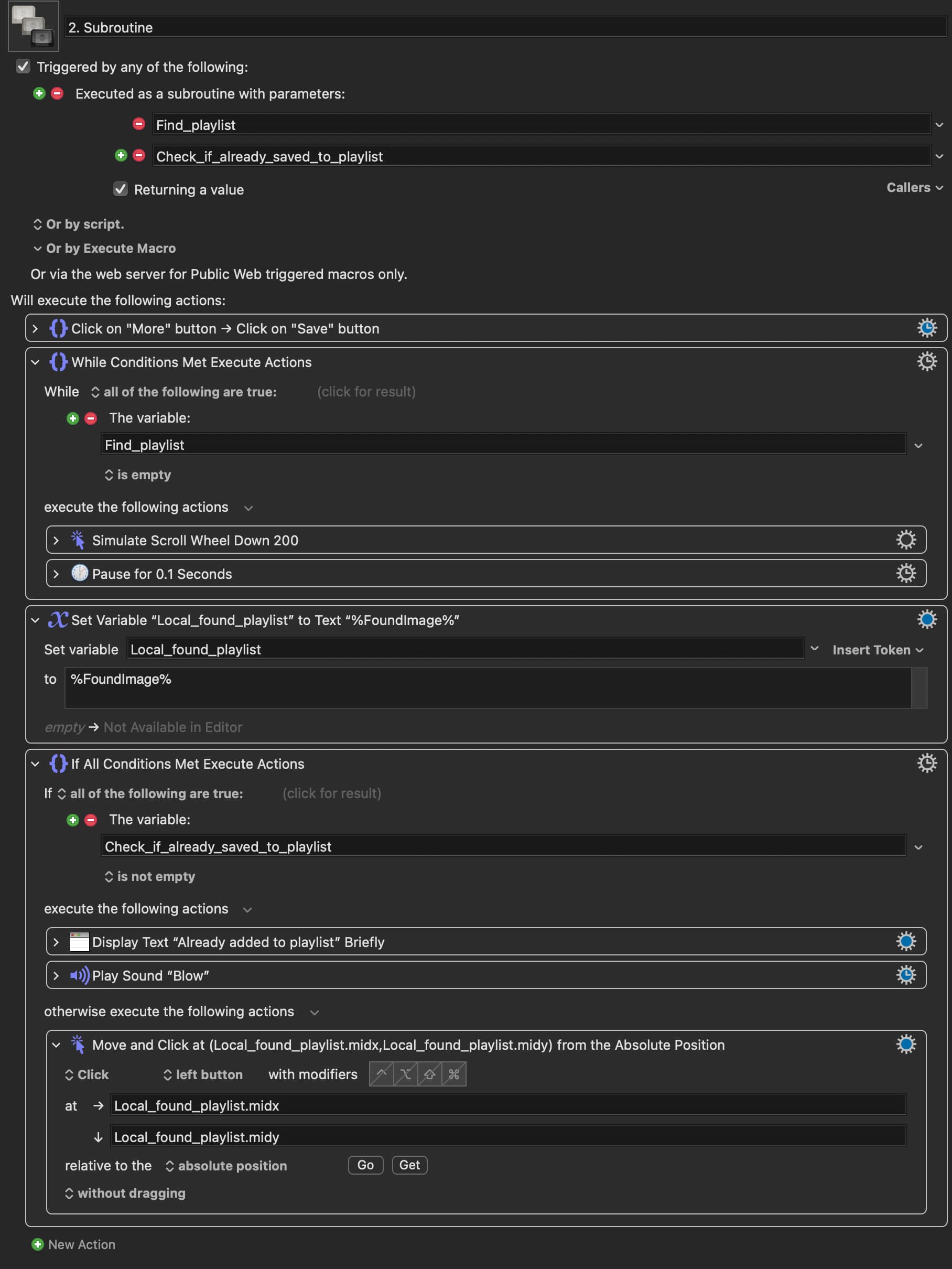 Sorry, I am not sure I get it because in my mind I thought that I don’t need the variable Find_playlist to change inside the while loop. I need it keep scrolling and only stop when the image (saved in the Find_playlist variable) is found, then the next action would be to save that image (But ofc like you said even what I said is true (which it’s not), subroutine doesn’t allow it to work that way). Set me straight please! .