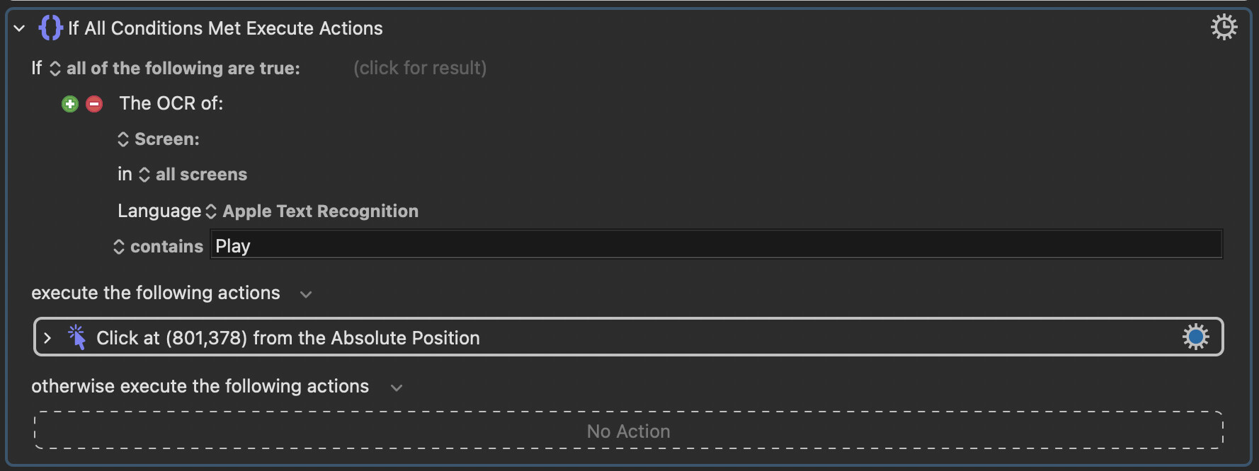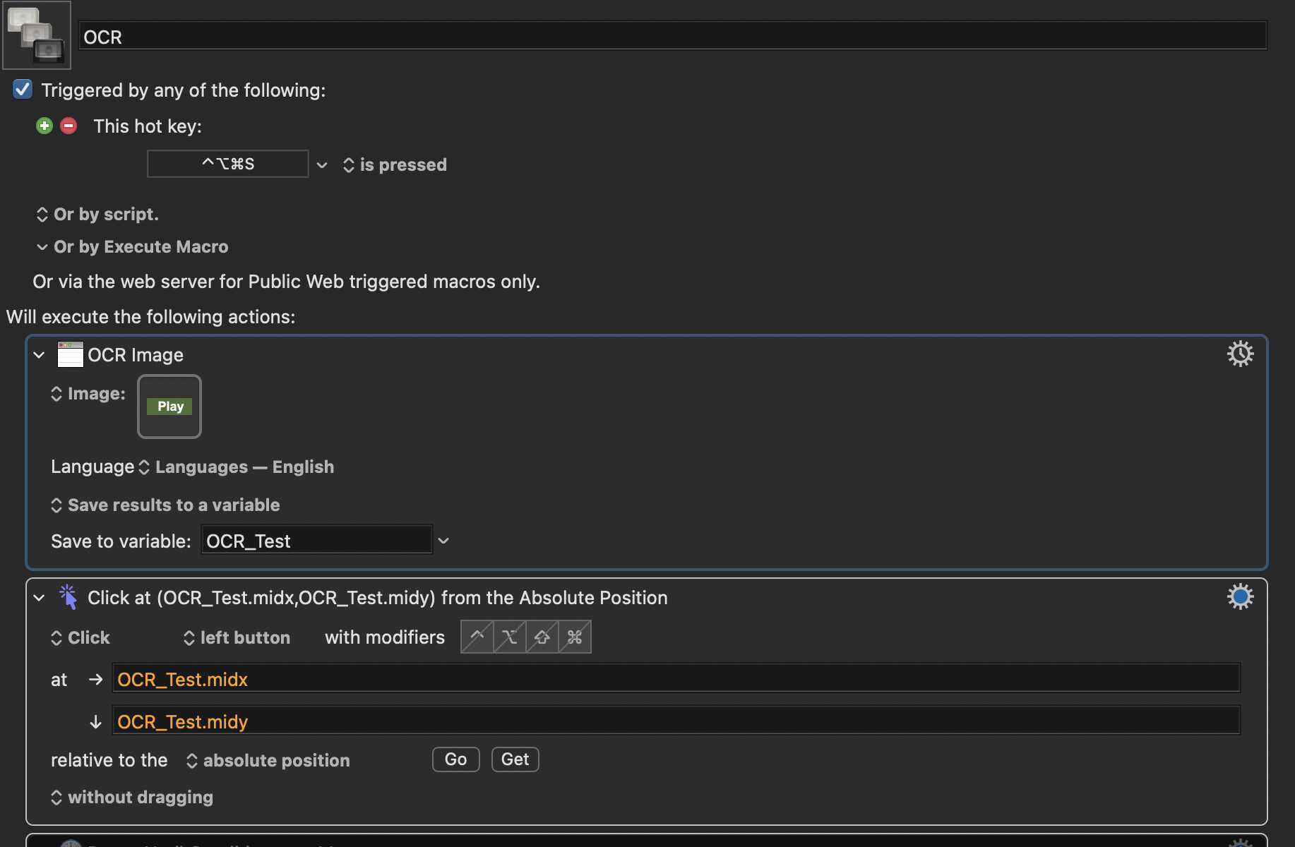Nige already told you, but I'll repeat it, you CANNOT get the location of any word that is found on the screen using OCR. (Although I'm told another product, BTT can do that.) In your sample code you are assuming that the variable OCR_Test contains the location of the OCR results. No, it only contains the actual words from the OCR function. And in your code you are performing OCR on a fixed image, so you will always get the same result. You might as well just use "Set Variable to Text" and assign it the word "Play" because that also gives the same result.